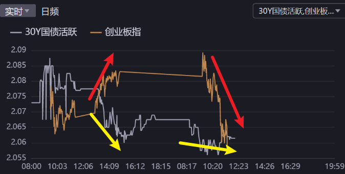 很简单的逻辑,因为昨天下午,股市加速上行的时候,债券就没跟啊,下图,把两日图拉出来,30年国债和创业板指,昨天下午开始就背离了,因此,今天创业板大跌的过程中,长端债券也就没怎么跟着下行——你把昨天下午之后的市场,连起来看的话,就合理了。