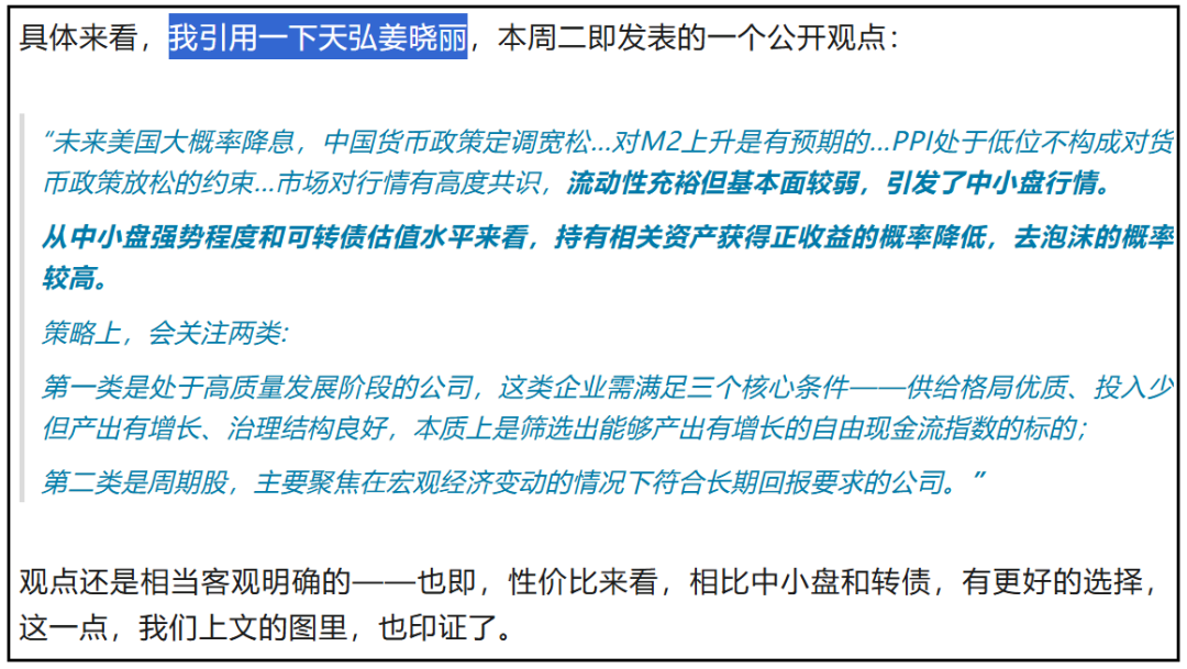 包括很多做固收+时间比较久的基金经理,对这块也会比较敏感,比如天弘的姜晓丽,这个,上周我在文章里也聊到过: