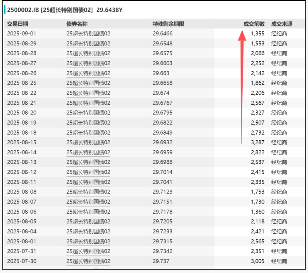 今天上午,30年国债的活跃券,成交笔数,只有500多笔,不及过去的一半,往前看,很明显,下图,30年国债活跃券250002,全日的成交笔数,从8月中旬以来,基本维持在日均2200-2300笔上下,而从上周五开始,跌破2000笔,昨天只有1300多笔,而今天,预计就只有1000笔上下了,笔数创新低——而10年国债,上午成交更是只有200笔出头。