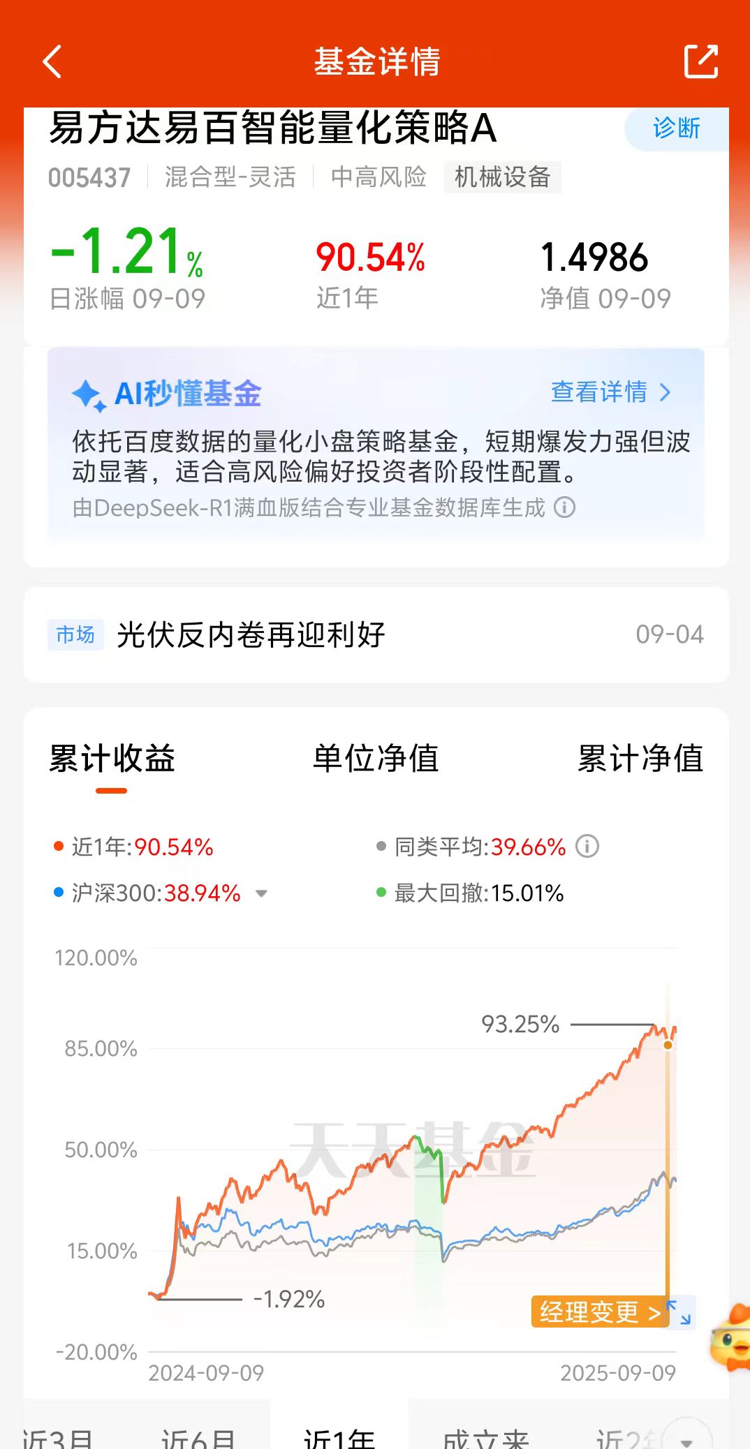 大盘今天反弹上涨,大科技板块表现不错,近期市场波动比较大,各大板块轮动速度也比较快,量化产品还不错,$易方达易百智能量化策略A(OTCFUND|005437)$近三个月涨了20.40%,近一年涨了90.54%,不论是短期还是中长期业绩都不错,量化产品可以高频调仓,不怕行业轮动,长期跑赢大盘,而且牛市的时候可以放大收益,看好这个方向,我准备分批加仓了!