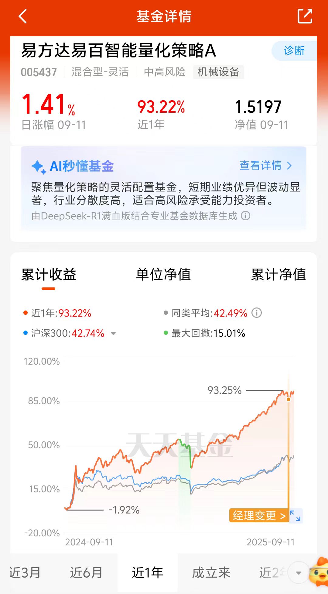大盘调整,量化长期来看表现还不错,牛市买量化产品不怕轮动,可以防止踏空,$易方达易百智能量化策略A(OTCFUND|005437)$近三个月涨了22.34%,近一年涨了93.22%,长期跑赢大盘,而且在牛市时可以放大收益,牛市各大板块轮动速度很快,量化基可以高频调仓,经理能力不错,看好这个方向,我准备分批加仓了!