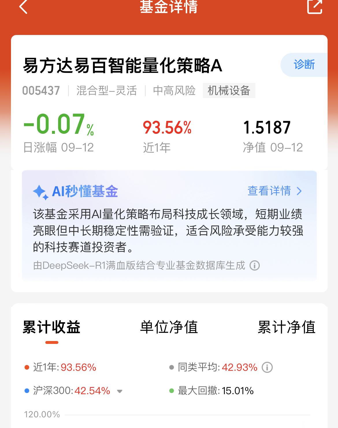 今天A股市场波动剧烈,超3300只个股下跌,板块快速轮动,操作难度很大。不过,这种复杂行情下,量化基金的优势就凸显出来了。我打算加仓$易方达易百智能量化策略A(OTCFUND|005437)$它采用优质量化策略,能通过高频交易捕捉市场转瞬即逝的机会。近一年涨幅超93%,远超同类基金和大盘,在牛市中更是能放大收益。面对快速轮动的板块,它可以凭借量化模型及时调仓,在不同行业中切换,无惧波动,看好它后续的表现 。