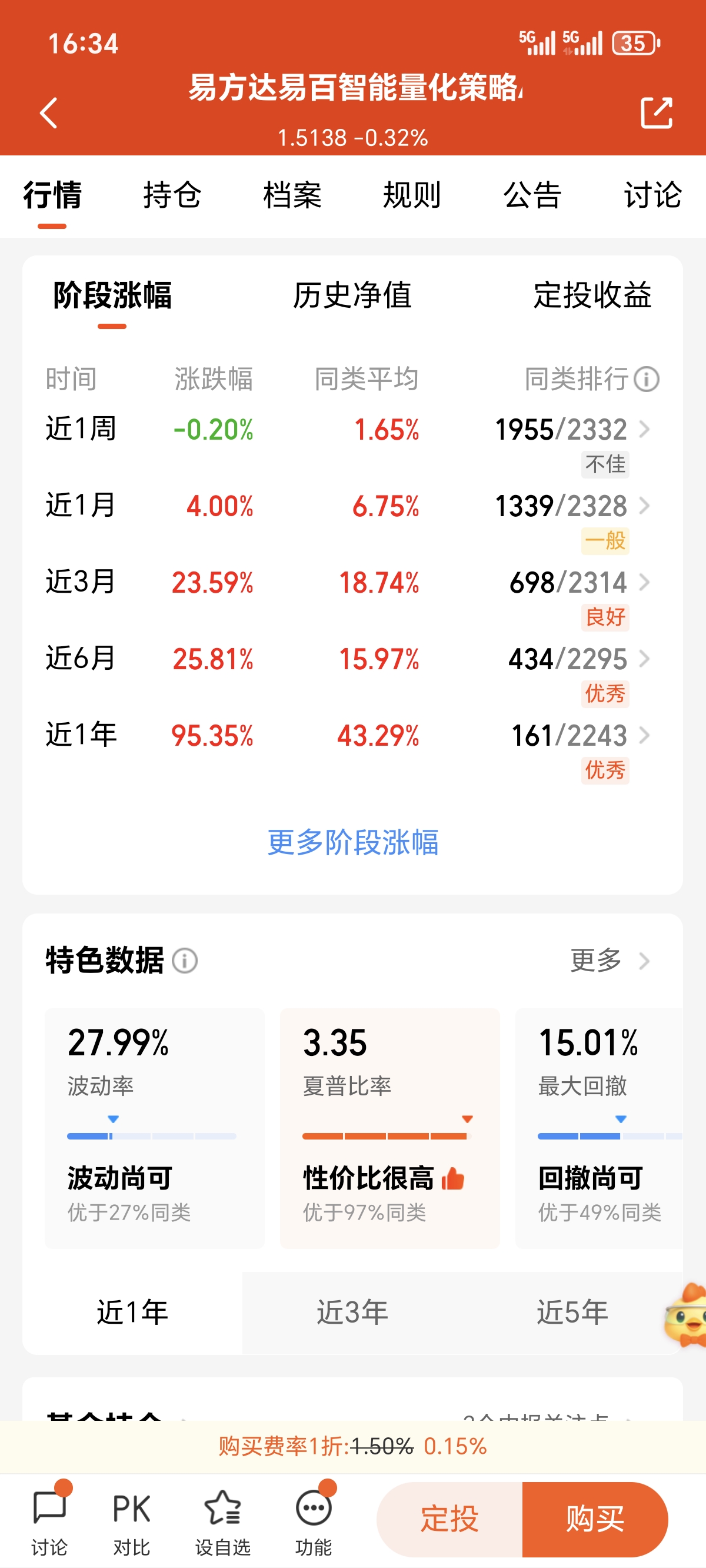 今日市场行情再次上涨,这波牛市走势真的是太香了,而在当下行情中想要不怕轮动,防止踏空,我会选择量化产品,以$易方达易百智能量化策略A(OTCFUND|005437)$来说,持仓策略以优质龙头为主,近一年涨幅高达95.35%,收益率远超同类平均水平,并且还能在牛市中放大收益,而我最看好的还是无惧板块轮动,长期收益持续跑赢大盘,我也果断布局一些了!