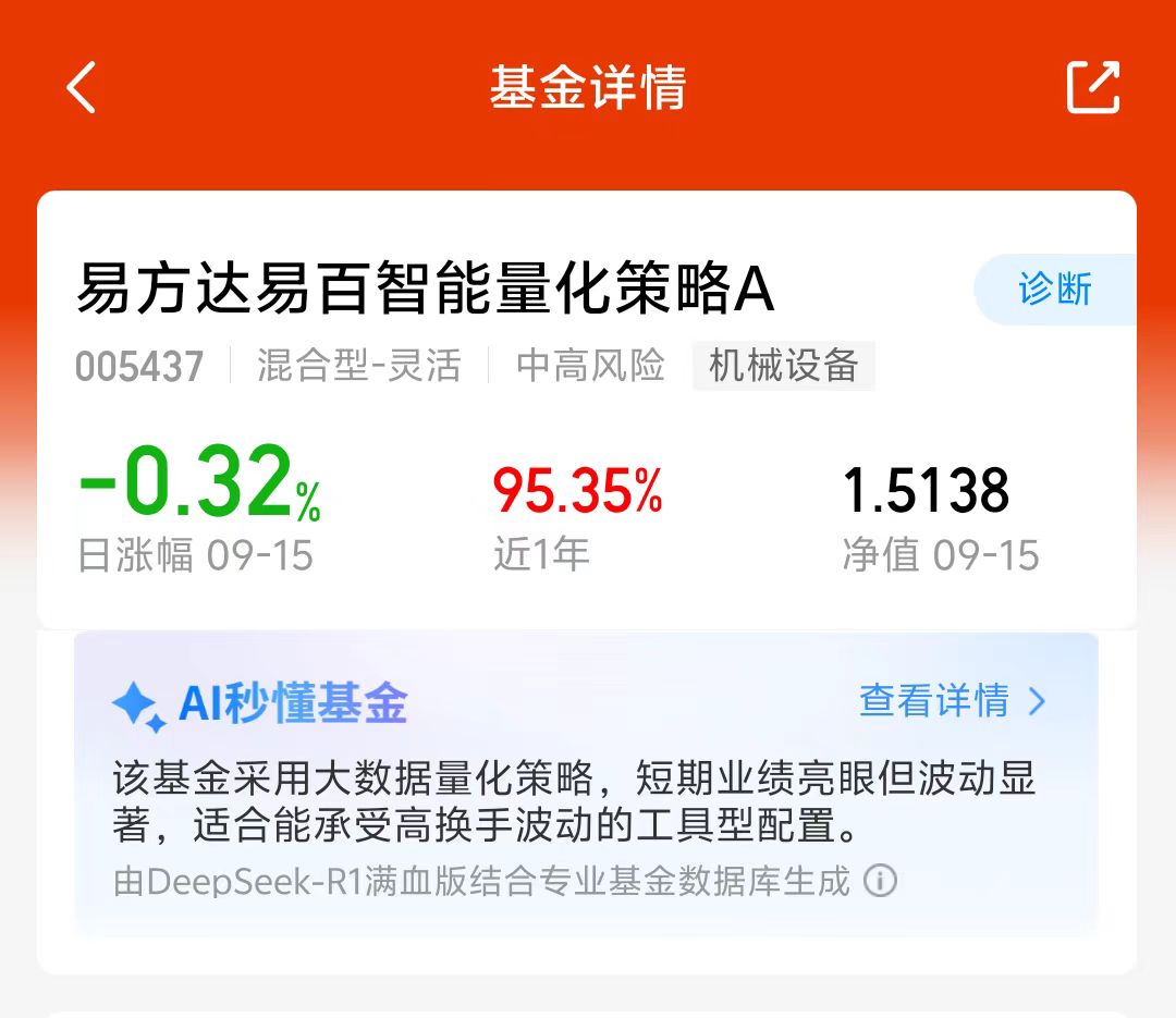 大盘近期波动比较大,板块轮动速度很快,这个时候我准备买点量化基,量化基高频调仓,不怕轮动,业绩持续跑赢市场!$易方达易百智能量化策略A(OTCFUND|005437)$近三个月涨了23.59%,近一年涨了95.35%,表现还不错,看好这个方向,我准备分批上车,期待它能给我带来不错的收益!