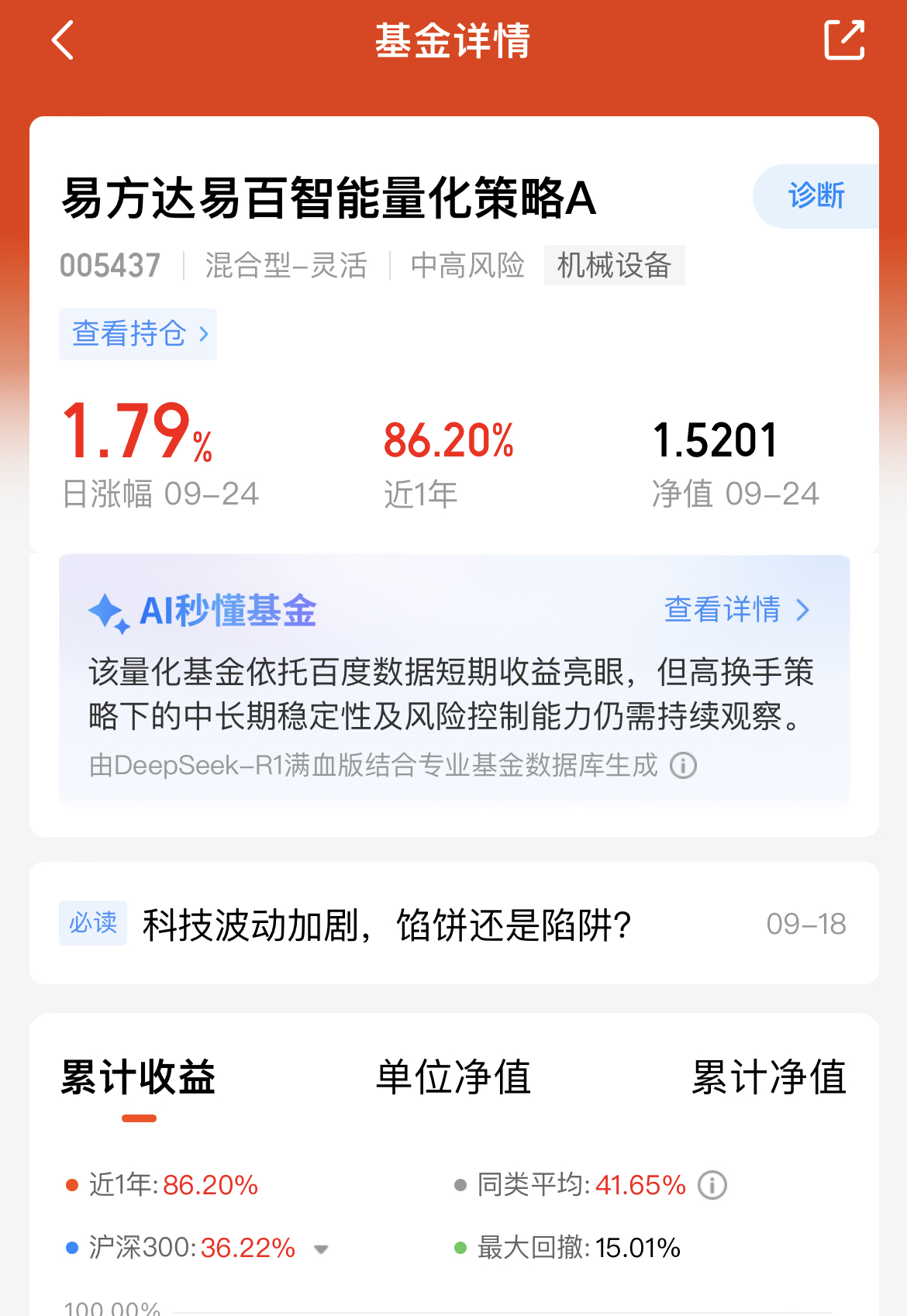 今天大盘低开高走,板块轮动依旧活跃。这种行情下,量化产品的优势很突出。$易方达易百智能量化策略A(OTCFUND|005437)$高频调仓,无惧行业轮动,长期收益稳稳跑赢大盘,近一年涨幅86.20%,业绩爆发力十足。它凭借优质投资策略,能在波动中精准捕捉机会,我打算定投这只基,趁着行情把握轮动红利。