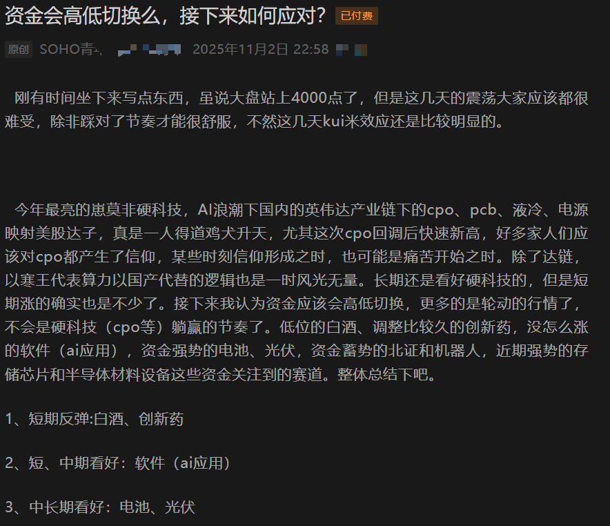 昨晚美股科技大涨,受制4000点小a犹犹豫豫。半导体高开后直接跳水,光伏、电池试着冲锋,很快也败下阵来。午盘过后科技直线跳水,妇联和寒王真是难兄难弟。早盘低开的消费反而拉起来了。到了这个位置,科技一堆减持的,想要继续上攻需要更多的资金,主力也不敢贸然进攻。科技这边存储和半导体材料设备还是强的,回调都是机会。