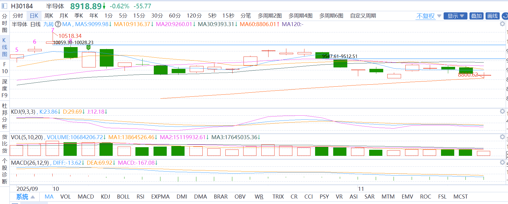 半导体:麦爸认为受受美股芯片股普跌(如英伟达、AMD)影响,但存储芯片涨价潮已启动,虽然技术面承压均线,MACD弱势。低位有企稳迹象,但麦爸还是坚持认为中长期仍是科技主线之一,技术面也存在反弹空间。麦爸今日选择继续低吸。