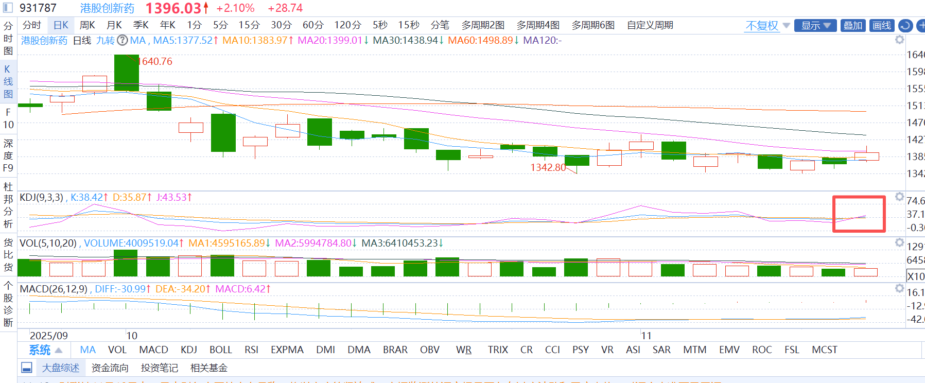 港股创新药:麦爸认为受秋冬流感高发,今日医药板块终于集体走强,技术面KDJ和MACD都金叉,但量能还是有些不足,麦爸继续躺平等待量能起来了再考虑做多。