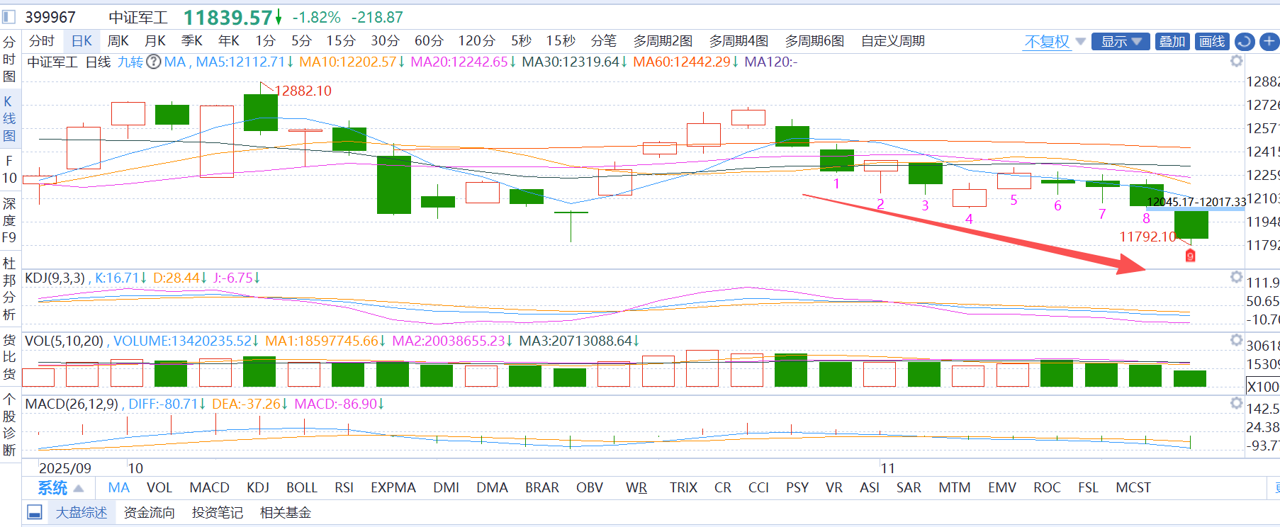 军工板块:麦爸认为板块缩量回调,维持区间震荡,目前KDJ超卖,短期有望技术性反弹,麦爸思路是它只适合中长线当防守。麦爸延续“躺平”策略,选择不动。