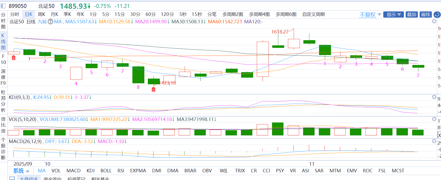 北证50:麦爸认为指数随大市调整,但波动幅度相对可控,继续围绕1500点整数关口震荡,成交量平淡,但政策预期(北证50ETF筹备)支撑长期价值。麦爸选择躺平,市场热点快速轮动中,小盘股风格仍有表现机会。