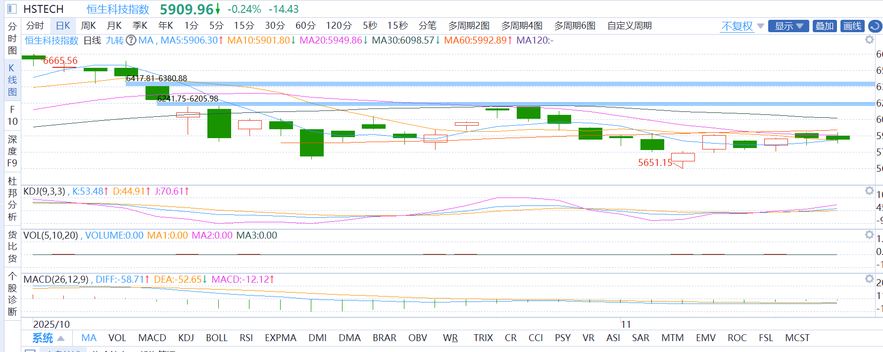 恒生科技:麦爸认为目前港股大市虽涨,但科技指数独自收跌,说明内部动能不足,技术面横盘震荡、均线粘合。麦爸选择躺平不动。
