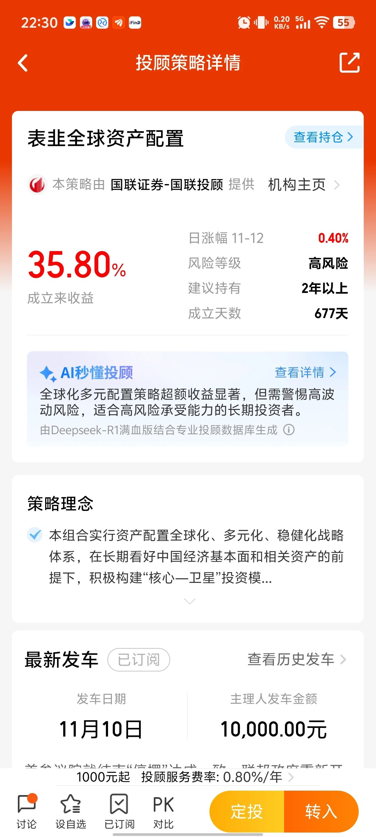 今天晚上刷新我跟投的投顾组合的净值,表韭全球投顾组合已经再创成立以来的历史新高,也意味着从理论上来说,所有跟投的用户都已经开始赚钱了。