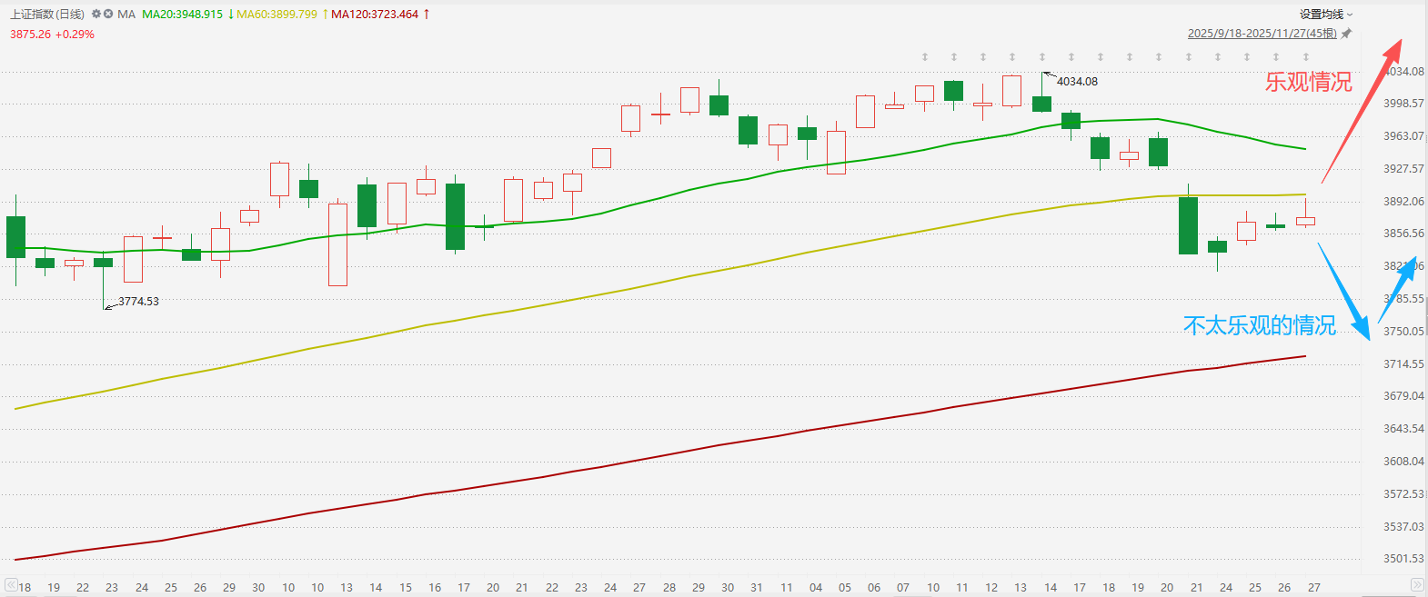 如果稍微回踩一下,大盘就继续上行,那自然是最好的,小跌大涨,大家都赚点钱。不过,对于悲观一点的预期来讲,如果后面几天回调力度过大的话,可能跌破前期的低点,继续下破3800点,朝着120日均线寻求支撑,也就是说这次的调整,可能会稍微久一点,以便为明年的春季行情出清筹码、腾出空间。
