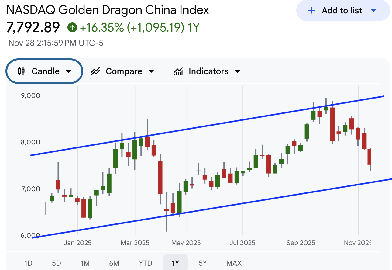 中概股:中概股近期维持宽幅震荡格局。此前在压力位受阻后逐渐靠近支撑位,走势缺乏明确方向。最近在下行途中出现反弹,显示出一定的止跌迹象,但整体趋势尚未确认,市场仍处于观望状态。投资者对中概股的态度依然谨慎,短期表现仍需进一步观察。