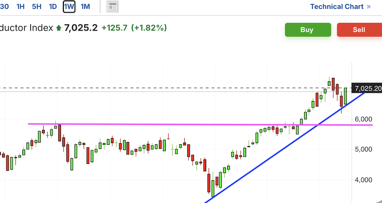 费城半导体指数:费城半导体指数此前突破历史高点压力位,带来一波强劲行情,但随后出现回调,跌破短期上涨趋势线。过去几日该指数连续反弹,呈现出重新企稳的迹象。半导体板块作为科技与AI产业链的重要环节,市场关注度依然较高,短期波动虽大,但整体走势仍具活跃性。