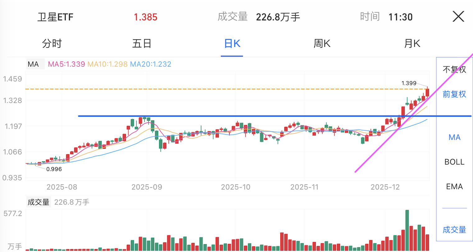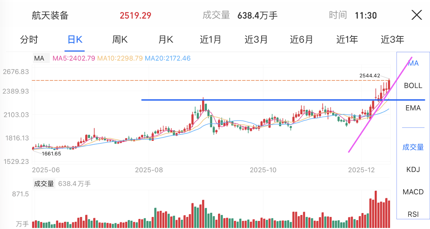 卫星、航天装备:在经历了长期底部横盘震荡后,近期成功放量向上突破了长期压制其走势的关键颈线位,打开了新的上涨空间。但鉴于短期涨幅较大,需警惕技术性回调,部分获利资金可能选择兑现利润,引起波动。