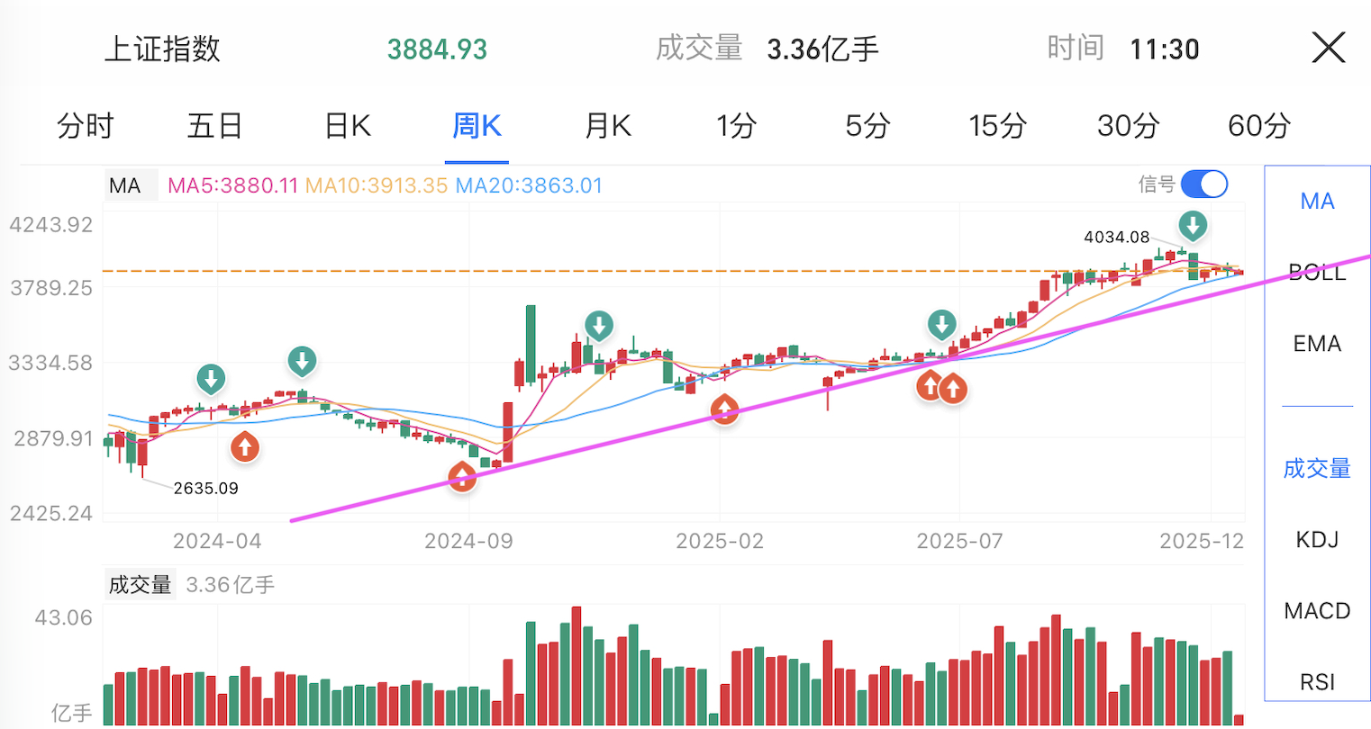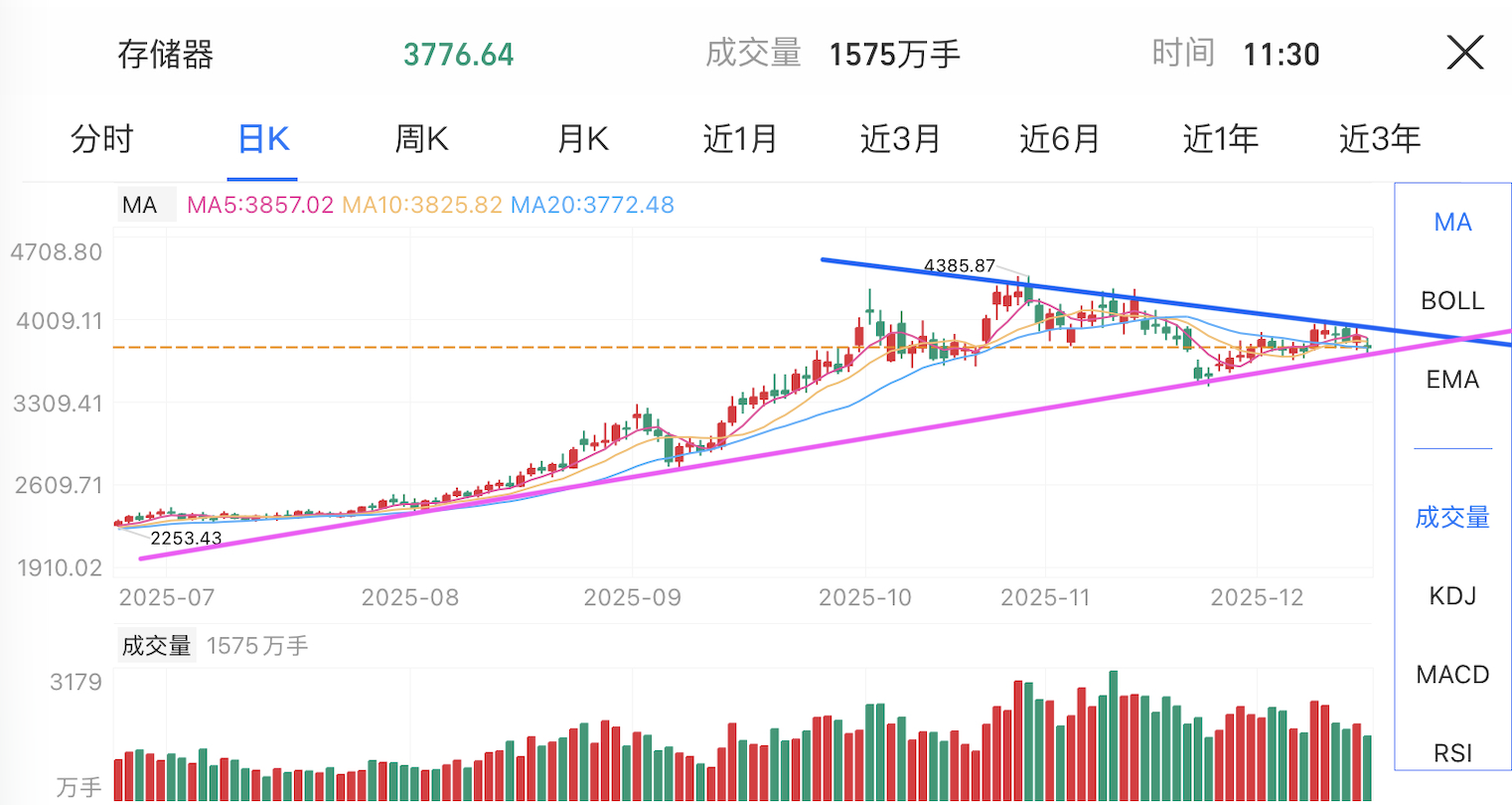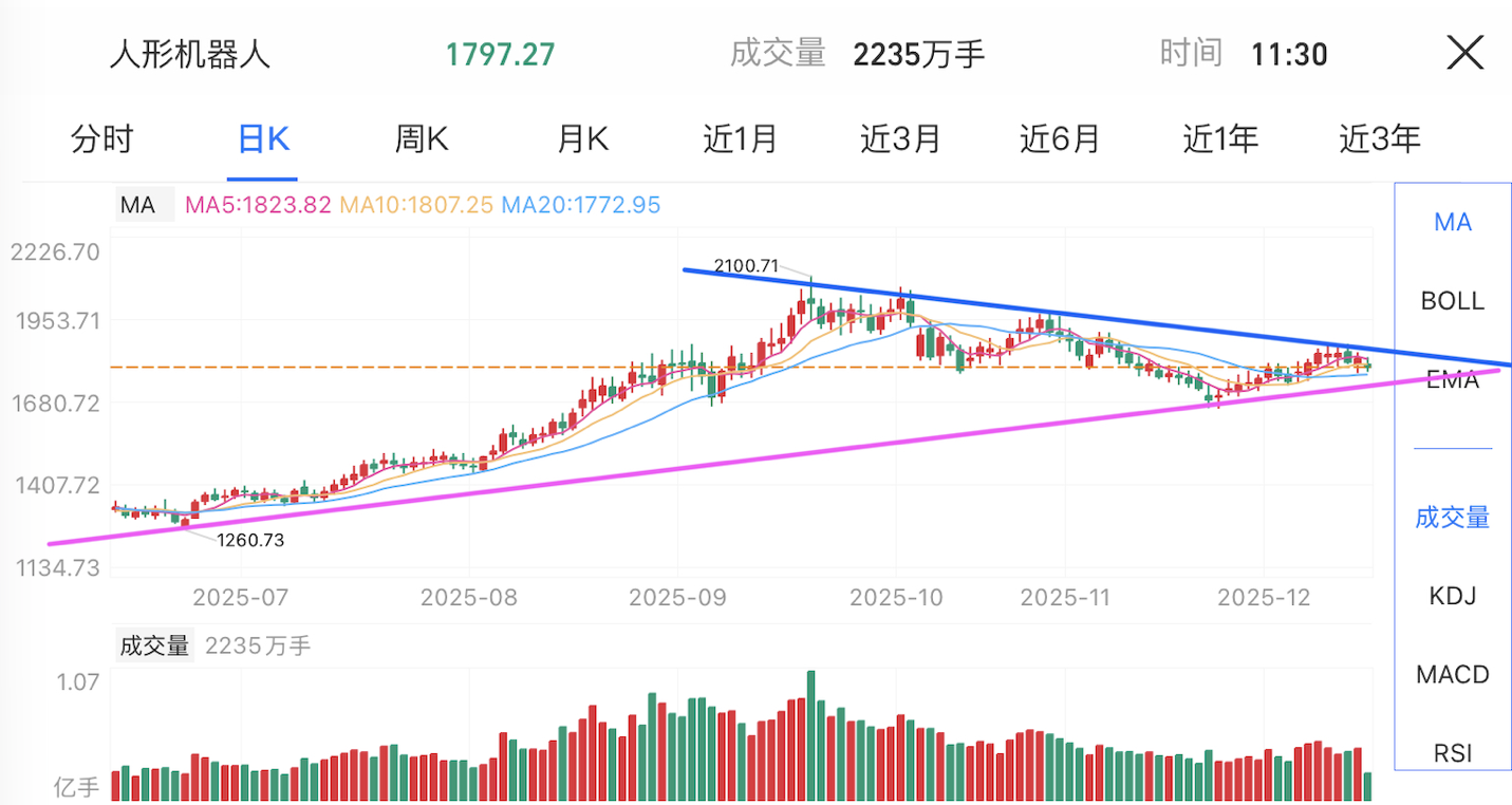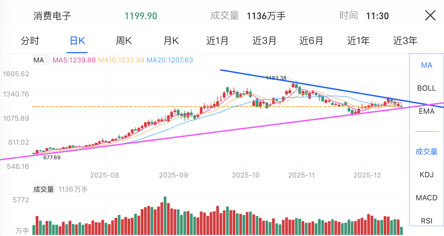 存储芯片、人形机器人、消费电子:整体保持中长期上升趋势,但短期冲高后在上升趋势线附近形成收敛三角形形态,市场即将面临方向选择。密切关注其突破方向,以确定下一步操作。