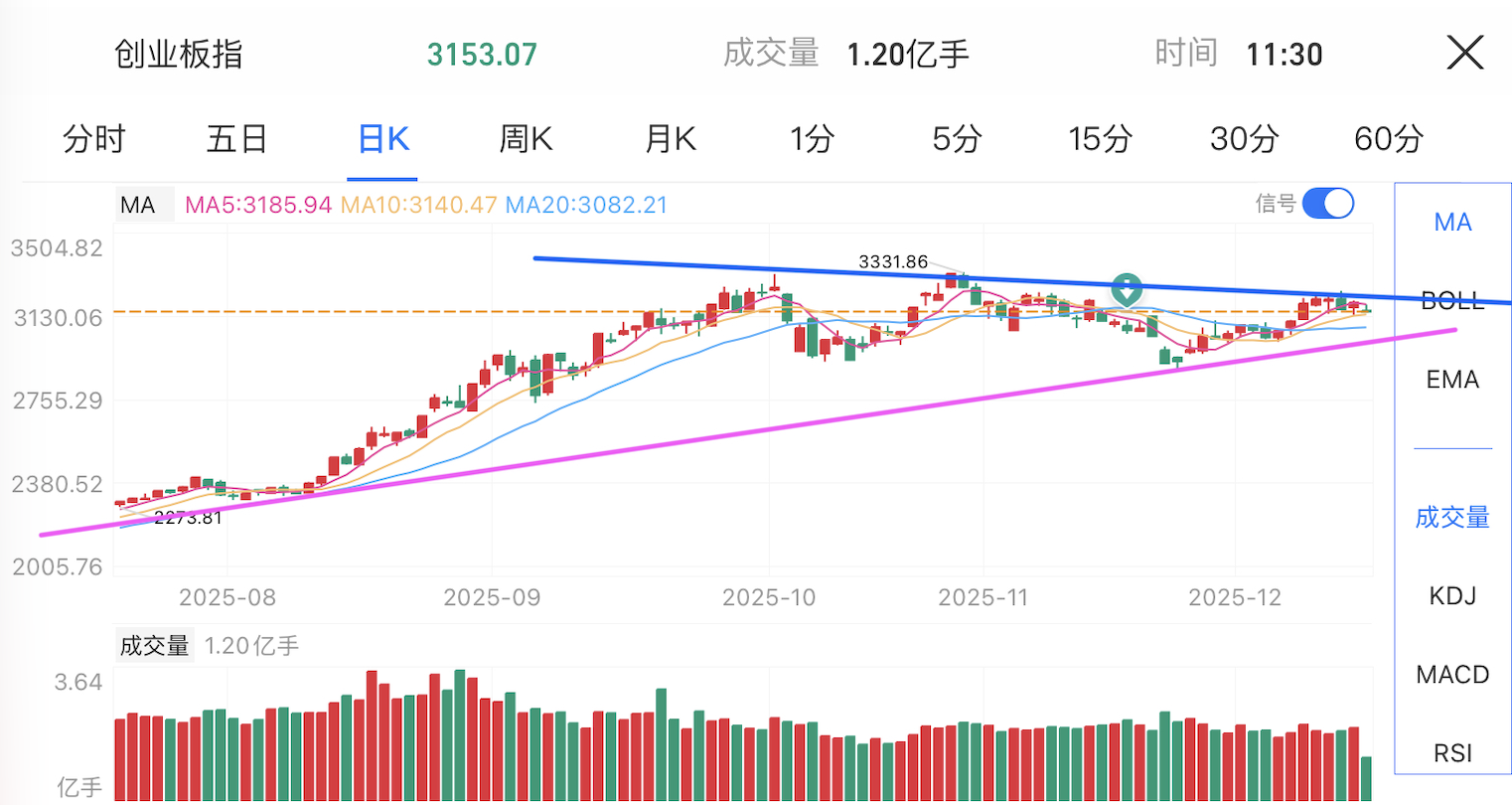 A股市场近期持续高位震荡整理。从技术上看,上证指数期在高位箱体盘整,尚未跌破中长期上行趋势线,市场情绪仍有支撑。而创业板指则受制于上方下跌趋势线压力,正在形成一个对称三角形的收敛形态,后市面临方向选择。
