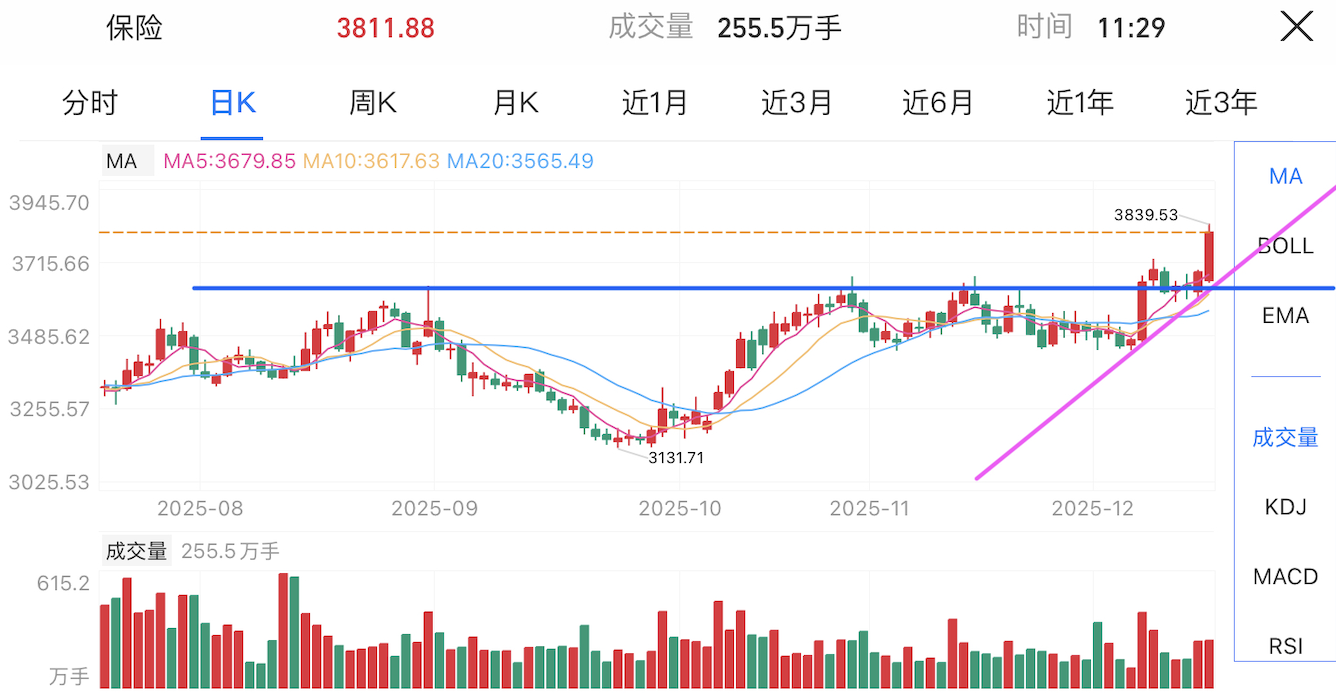 保险:近期横盘震荡后大幅飙升,并突破了前高压力位。如果能站稳并确认突破有效,则打开了上行通道,预示着新的行情可能到来。