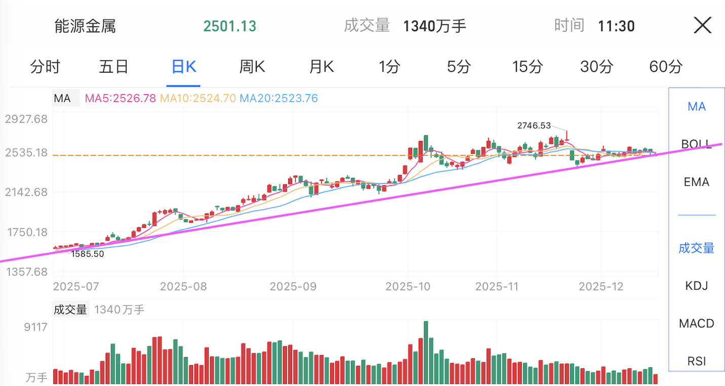 能源金属:中长期一直处于震荡上行态势,但近期回调至前期低点支撑位后开始窄幅震荡,显示出该支撑位具备一定的韧性。然而,如果成交量未能有效放大配合反弹,一旦跌破此支撑位,那么将继续下行,寻求更低支撑。