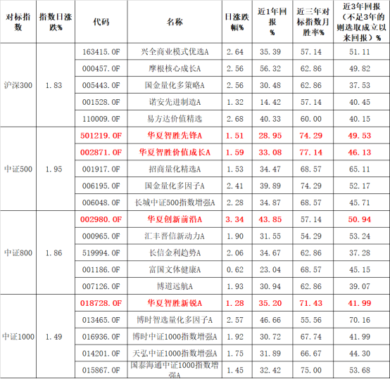 不过还是要提醒大家,短期的急涨急跌迷惑性较大,我们还是更应该参考长期维度的胜率,以近三年月跑赢对标指数的概率来看,胜率超70%的华夏智胜先锋和智胜价值成长;华夏智胜新锐、国泰海通中证1000指数增强、国金量化多因子等,也都值得大家作为长期投资的参照物。对指数的高胜率,意味着行情来的时候能跑赢大盘;而震荡的时候也足够减震,因此我们的定投计划也不妨关注这些产品,作为资产配置中安全仓的存在。