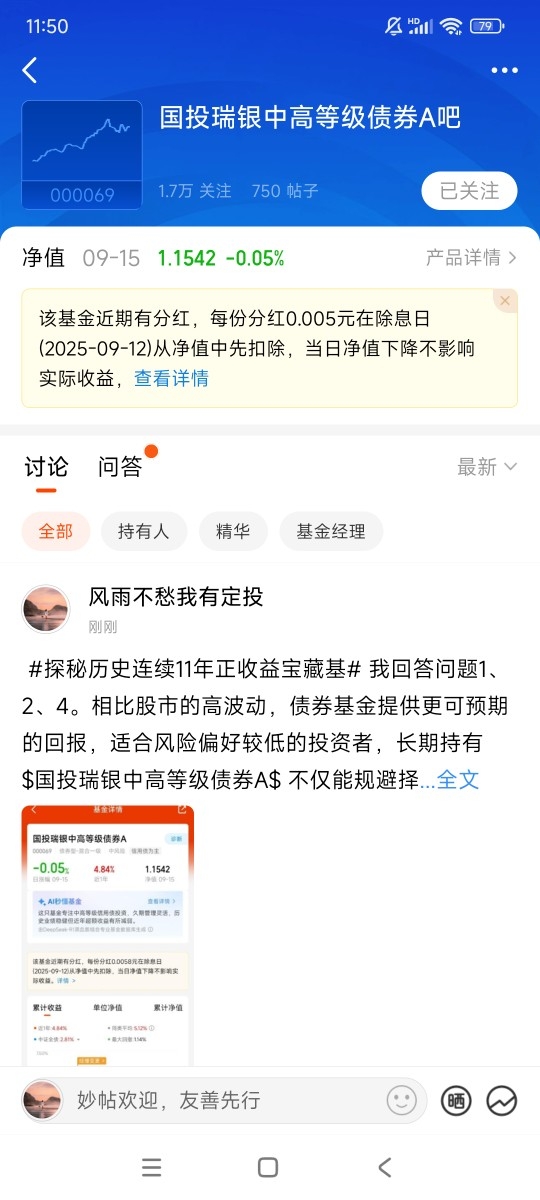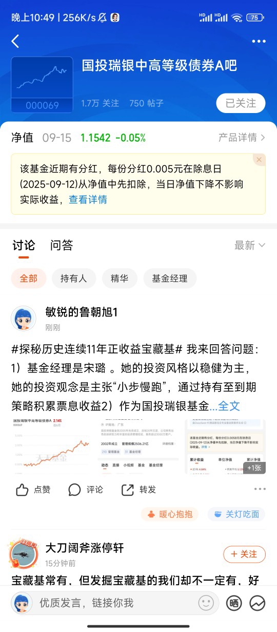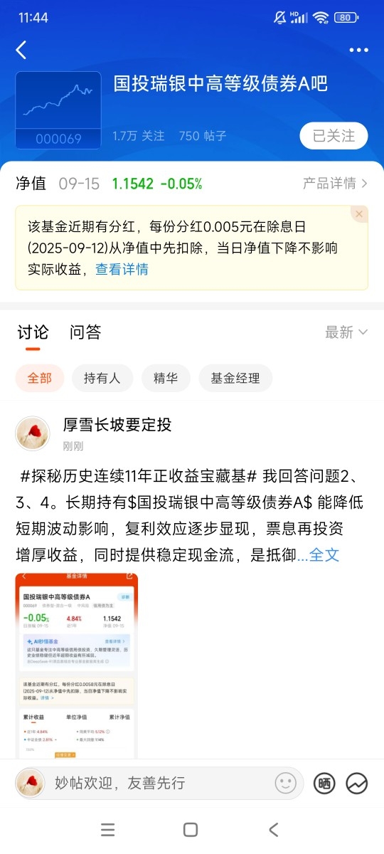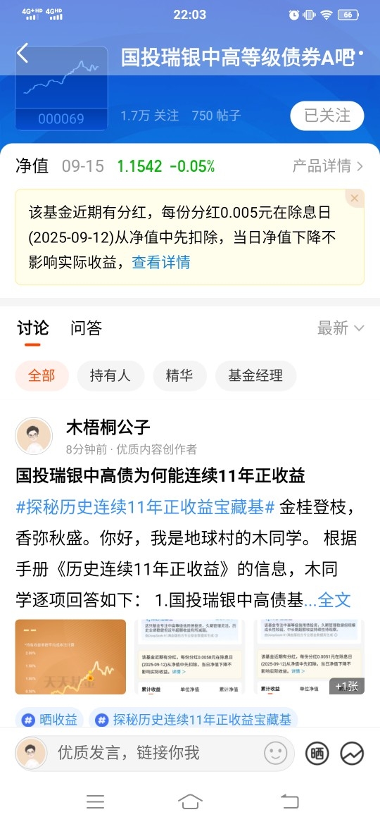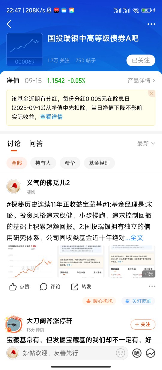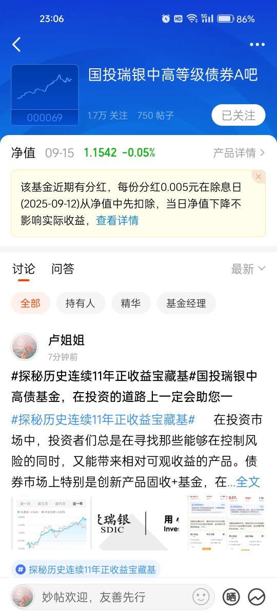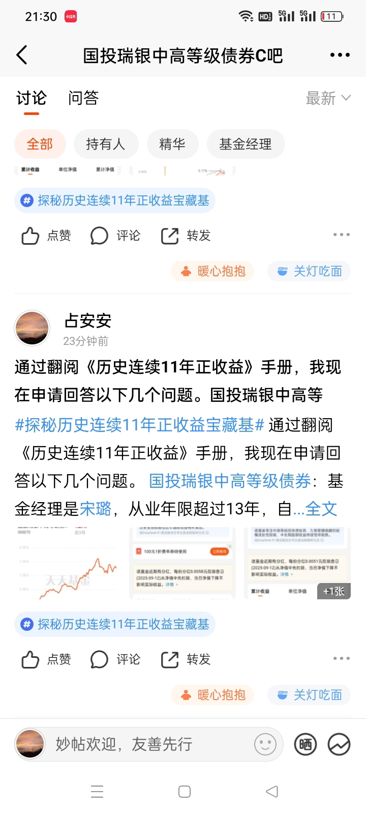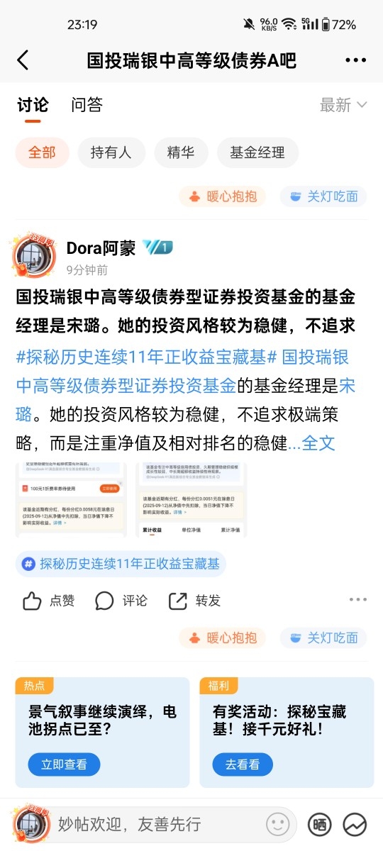 1)您需要进入国投瑞银中高等级债券型证券投资基金的基金吧,发帖带上话题#探秘历史连续11年正收益宝藏基#