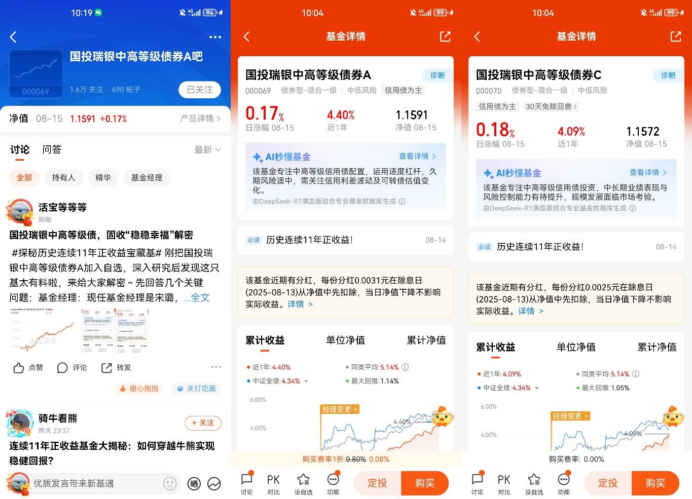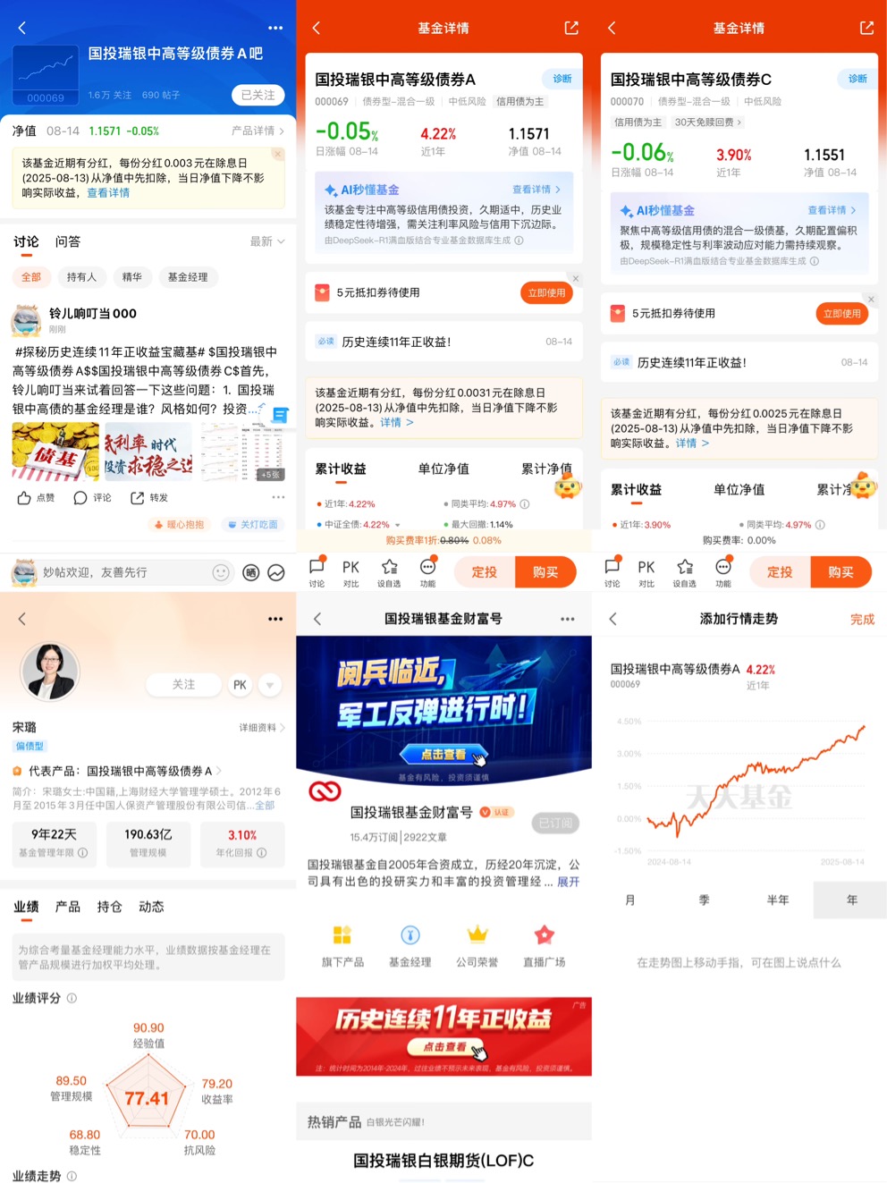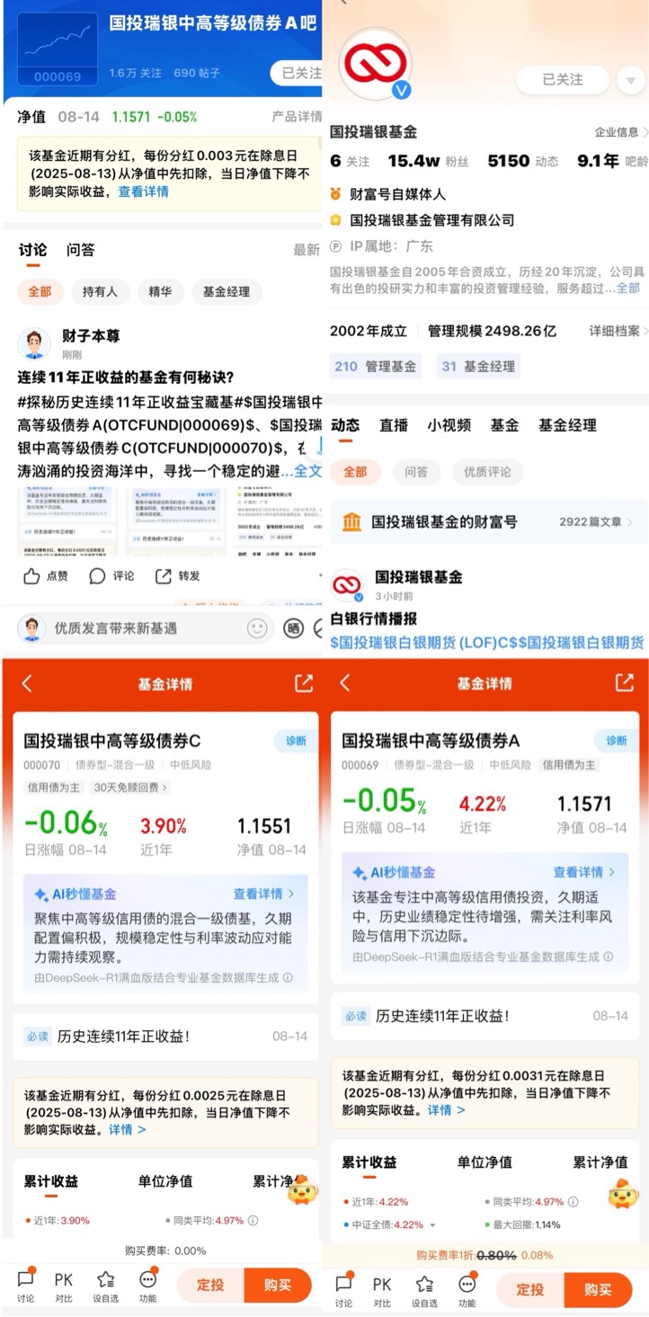 前往讨论区$国投瑞银中高等级债券A(OTCFUND|000069)$ $国投瑞银中高等级债券C(OTCFUND|000070)$,细读手册《历史连续11年正收益》,然后回答以下这几个问题: