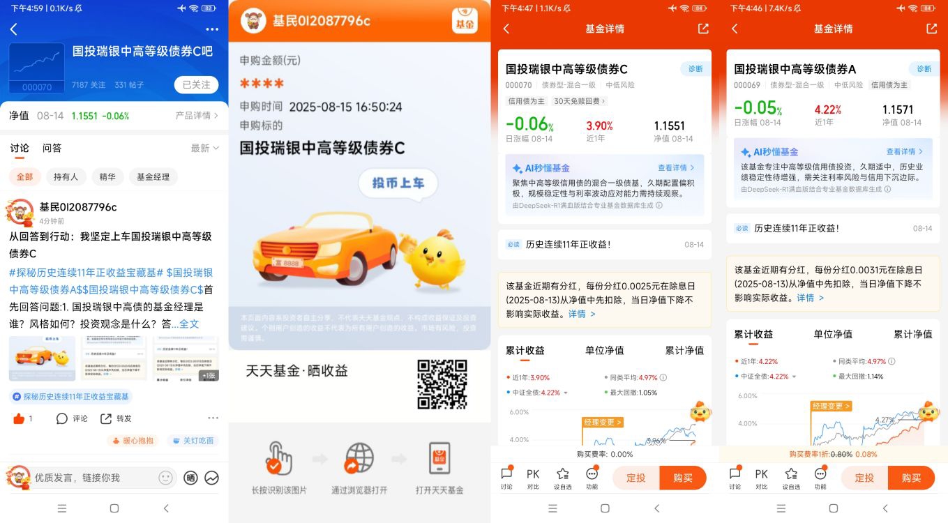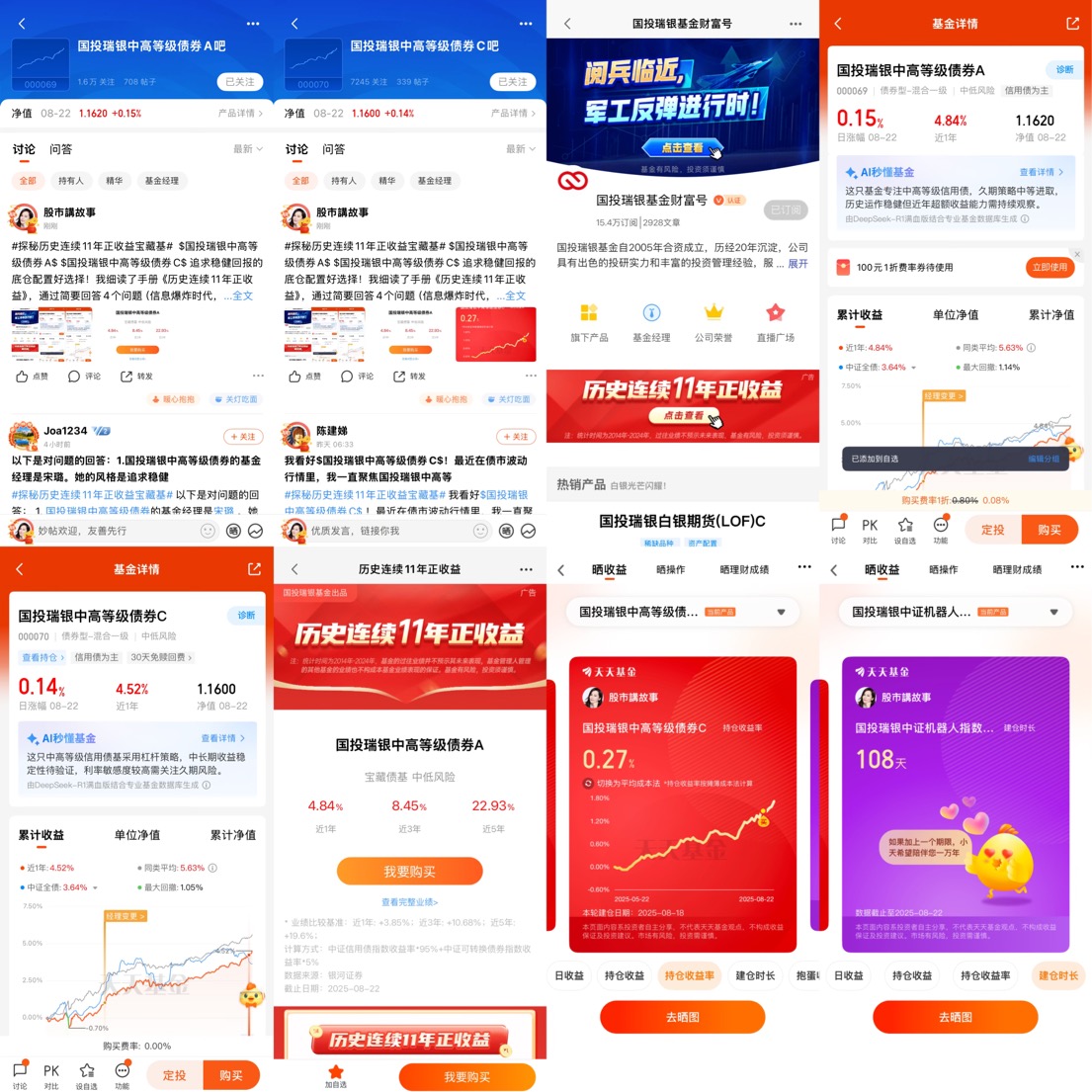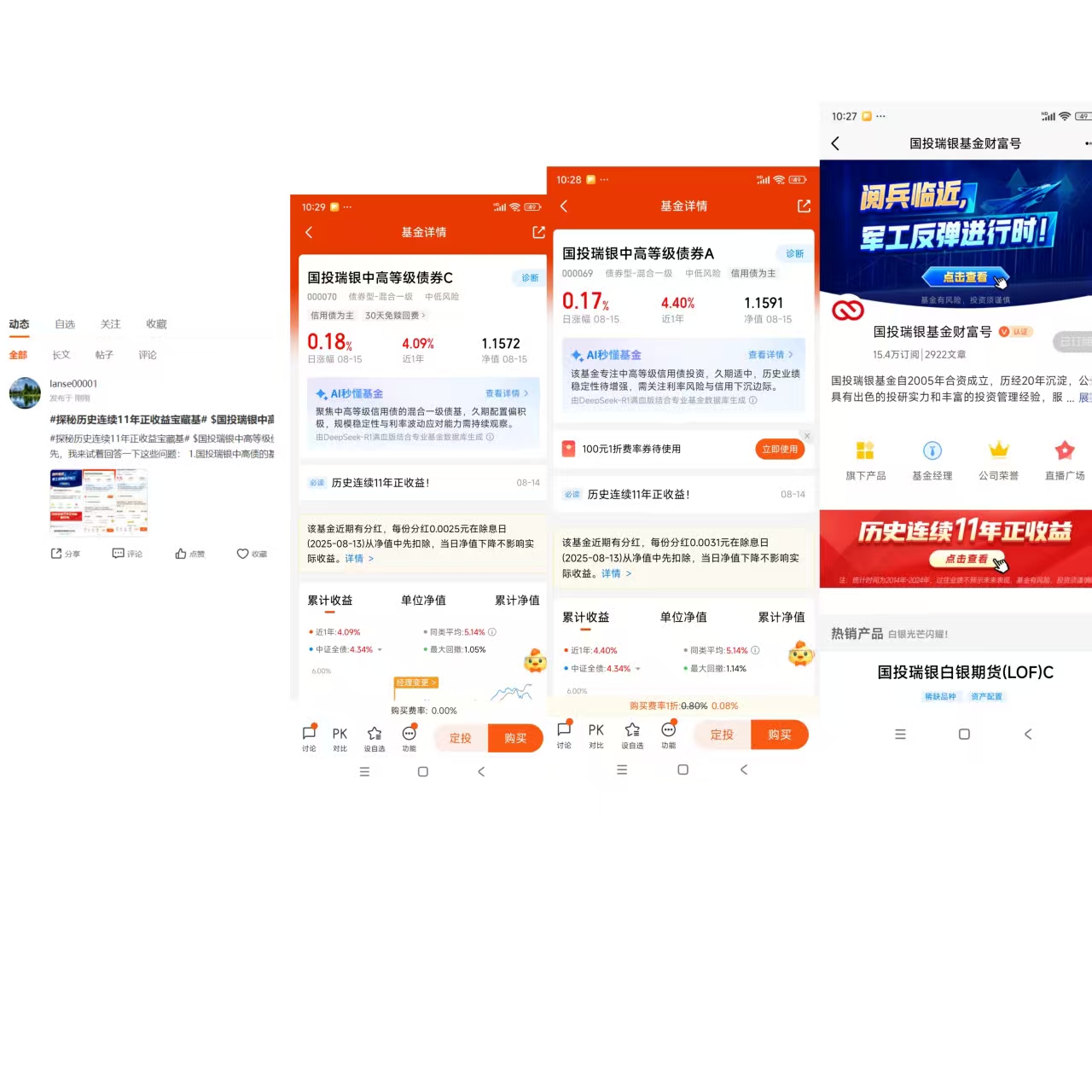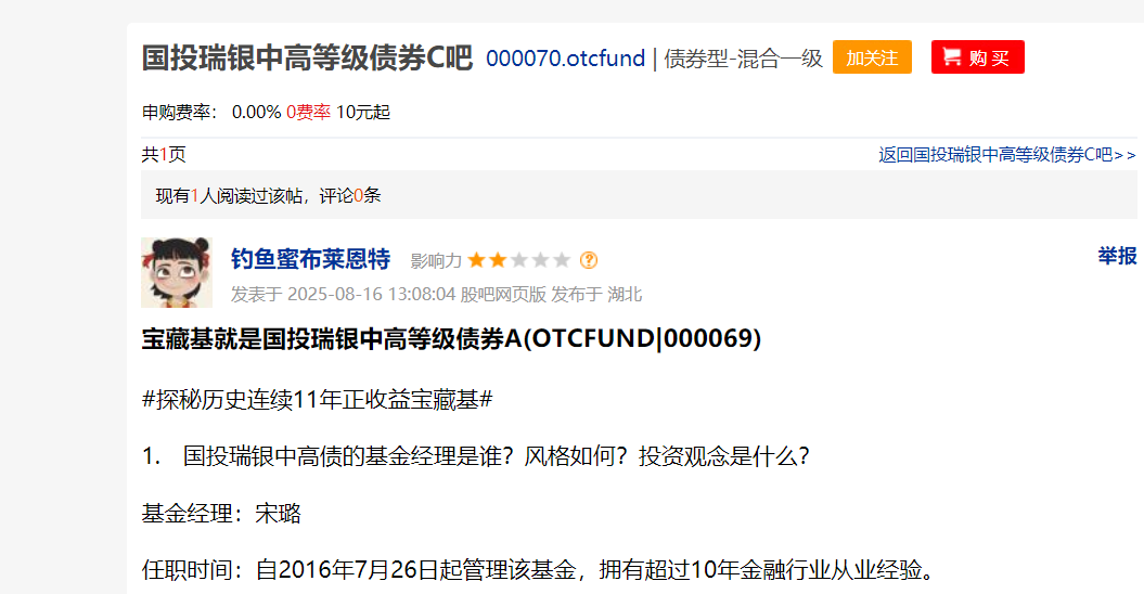 1)您需要进入国投瑞银中高等级债券型证券投资基金的基金吧,发帖带上话题#探秘历史连续11年正收益宝藏基#