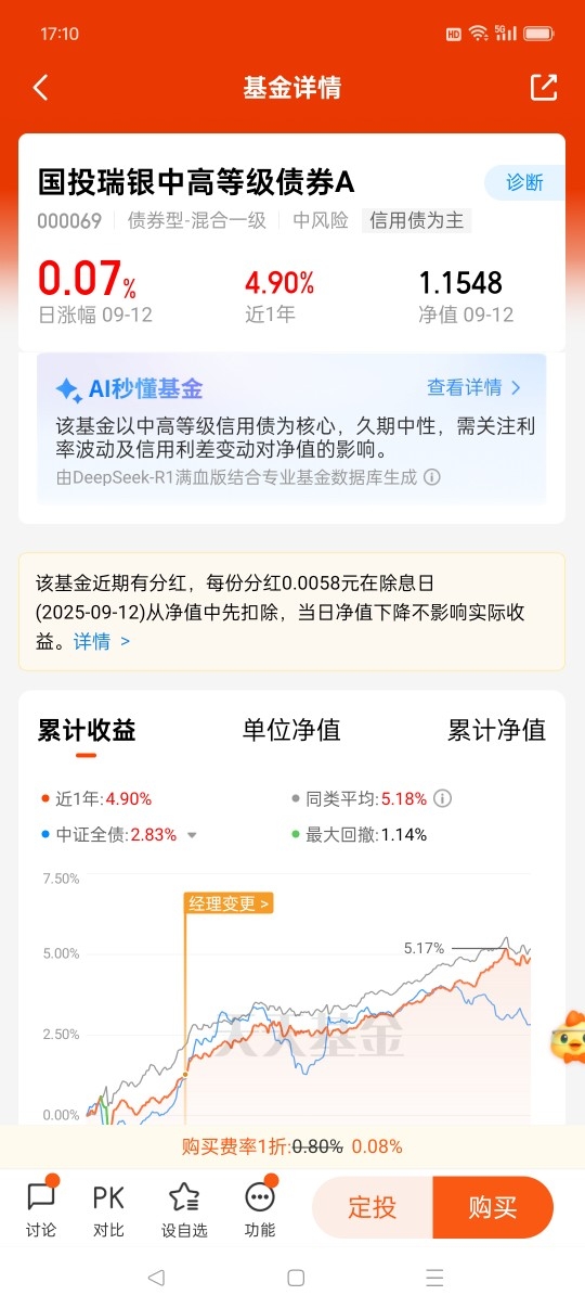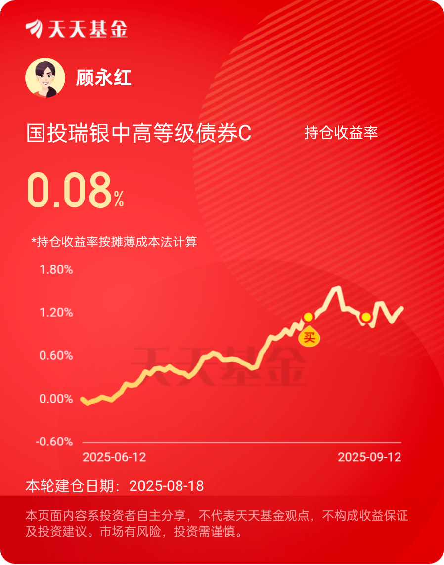 两点补充内容:一是国投瑞银中高等级债券基金9月10日公告实施2025年第8次分红,A类、C类、D类、E类份额,每份分红金额0.0580、0.0510、0.0570、0.0550元,9月12日为除息日,让持有人再次体验到分红的快乐!二是国投瑞银中高等级债券基金机构占比较高,说明得到机构投资者的认可,二季报显示:A类份额机构占比68.69%,C类份额机构占比24.46%。