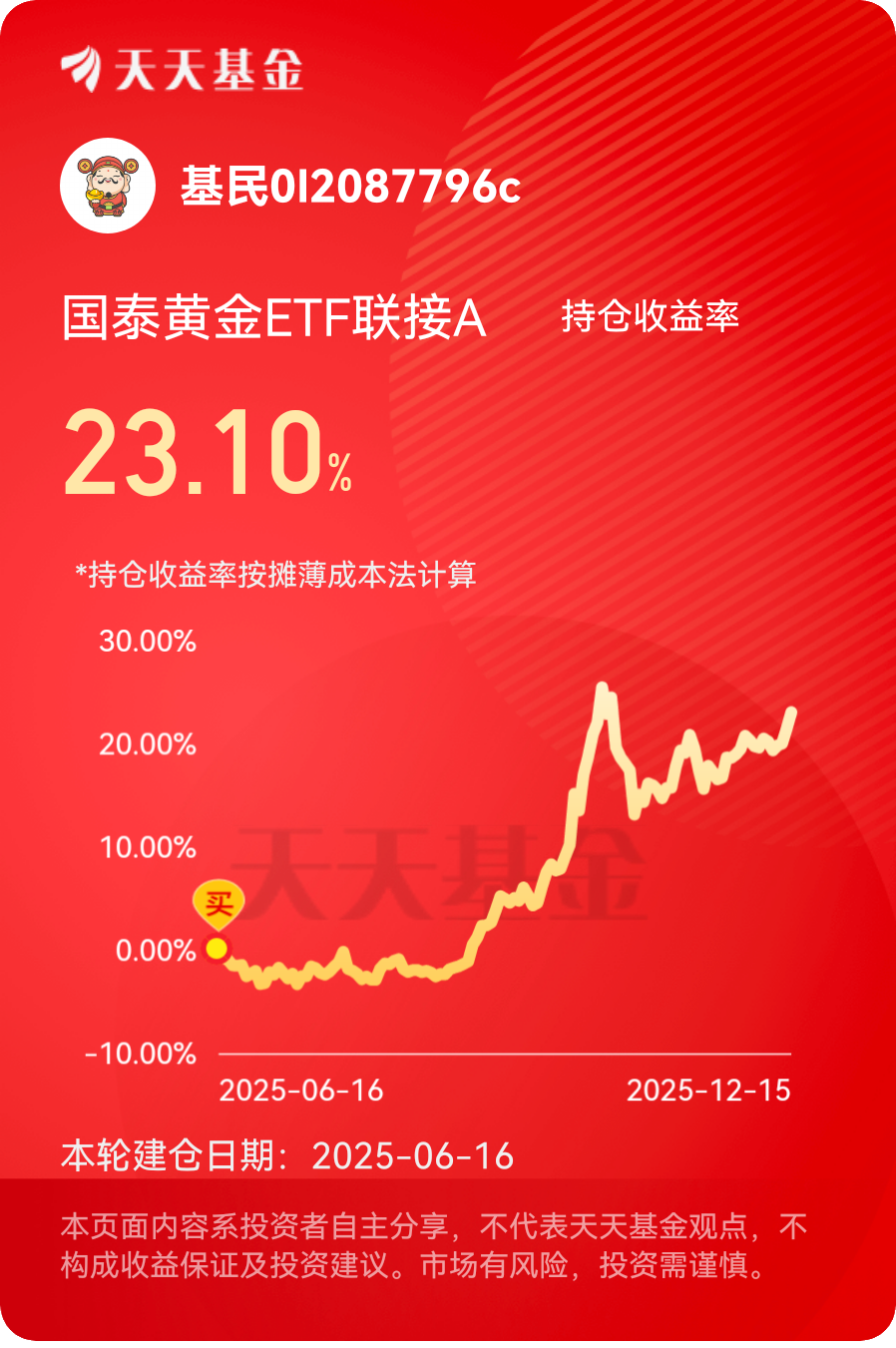 作为一名注重稳健增值的投资者,在市场波动加剧、理财收益分化的当下,国泰黄金ETF联接A(000218)早已成为我资产组合中不可或缺的核心配置。从最初尝试性买入到如今坚定长期持有,这只基金用扎实的业绩表现和优质的持有体验,让我收获了满意的收益,更让我对其投资前景充满信心,未来将持续加仓,也真心推荐给每一位追求稳健的投资者。