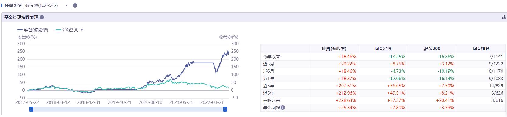 从钟赟自身的偏股型基金指数表现看,截至2022年8月26日,任职期间累计回报为228.63%,年化回报率为25.34%,显著超过同类基金和沪深300指数,在同类基金经理中业绩排名3/616,属于非常能打的基金经理。