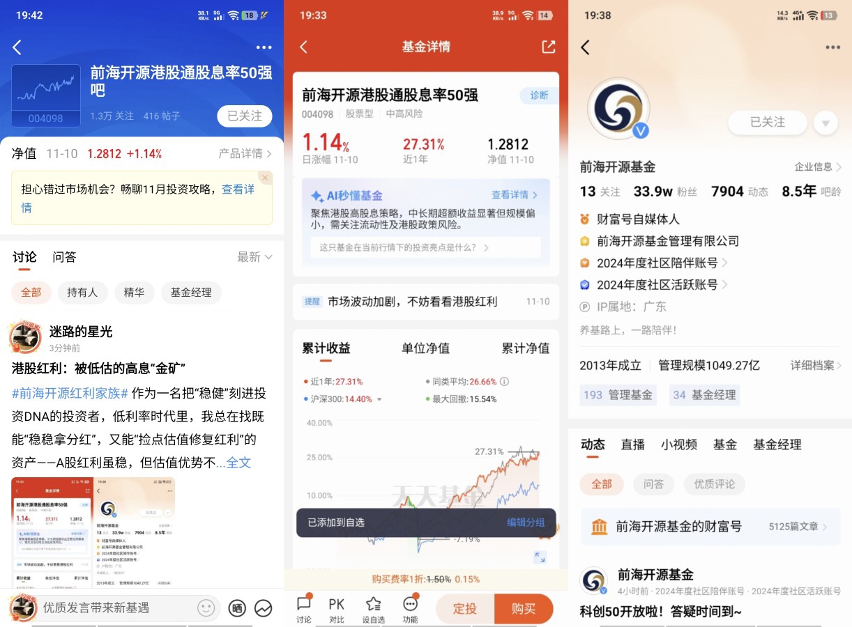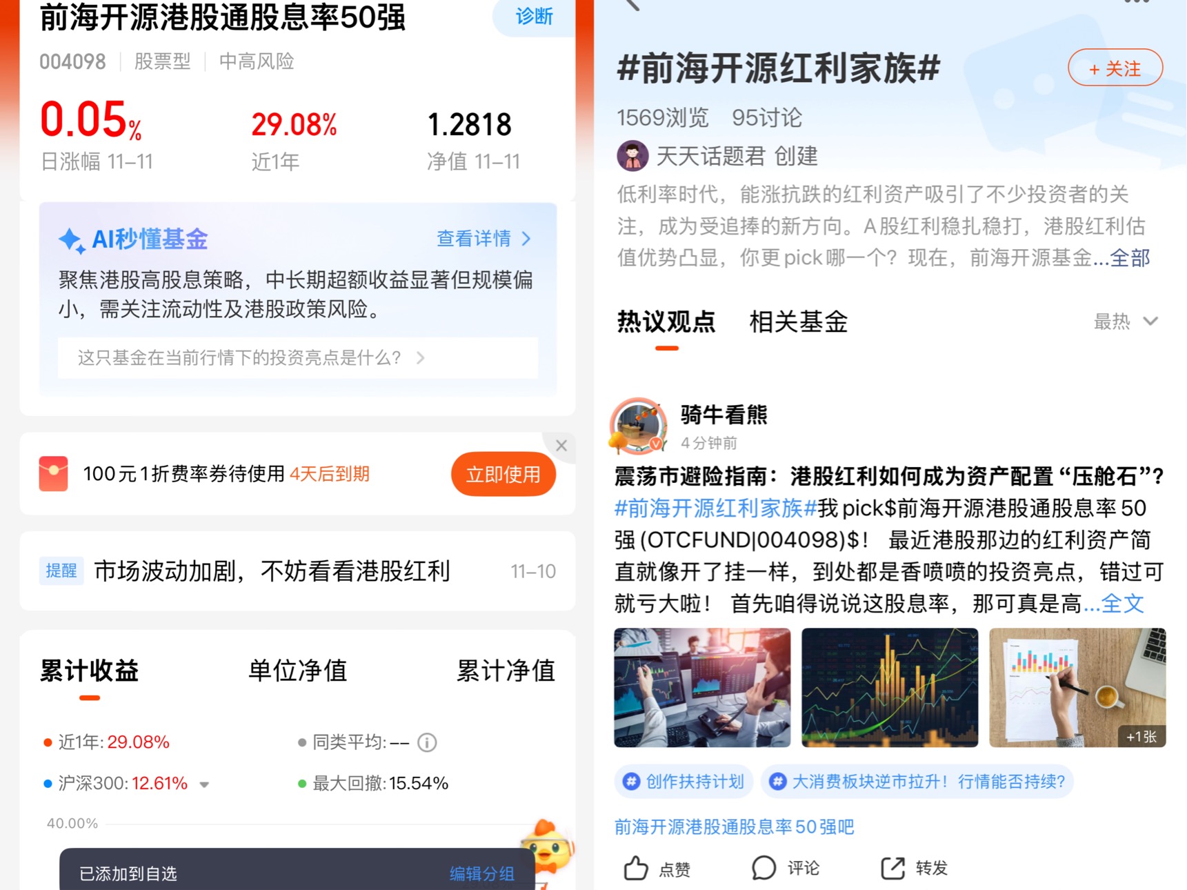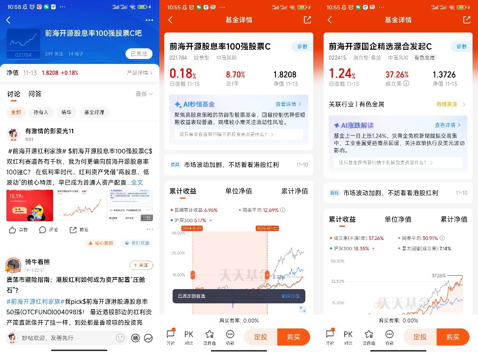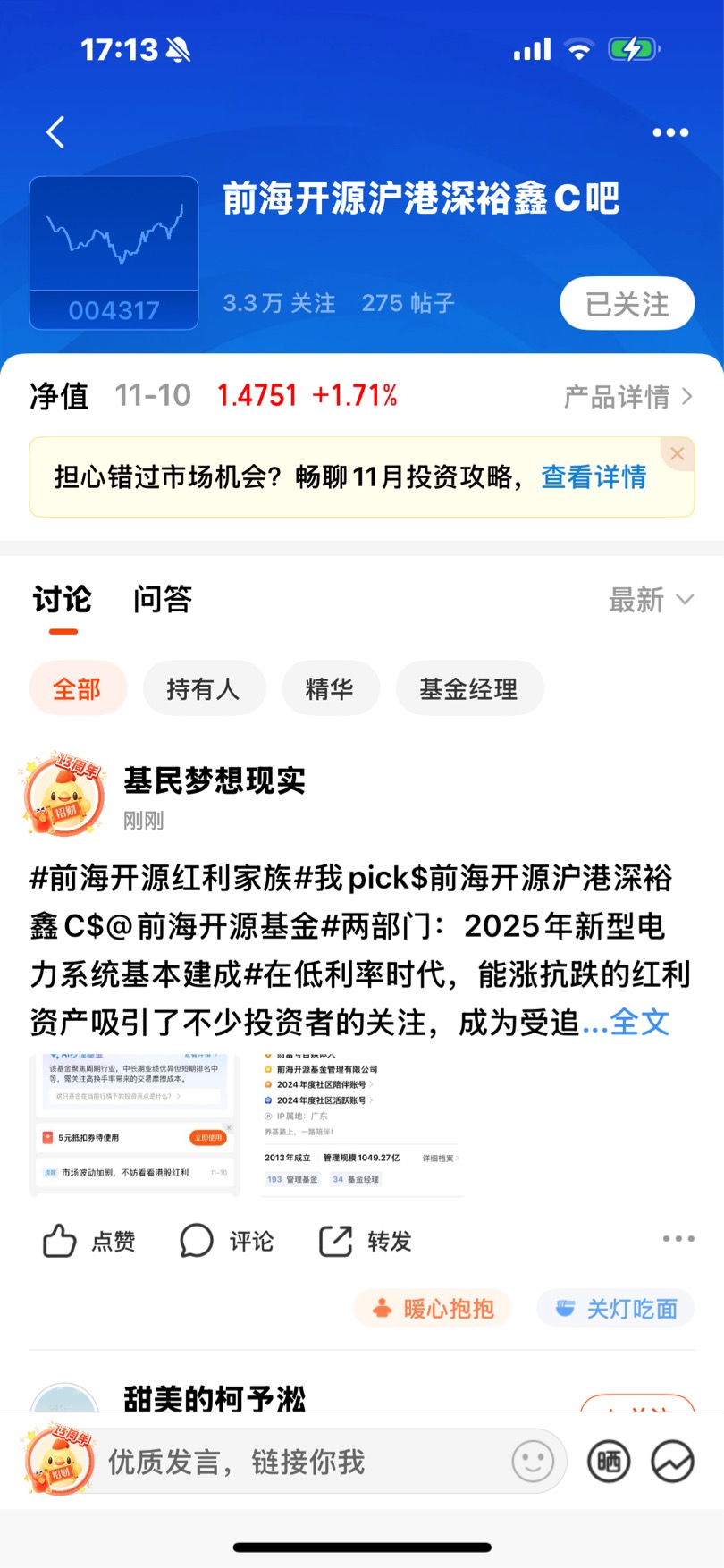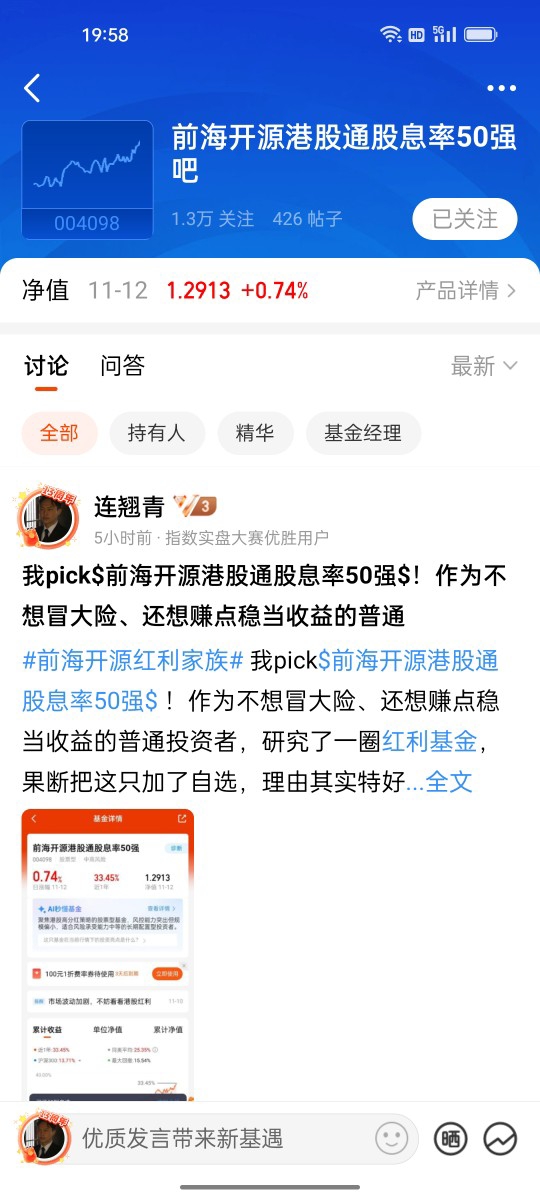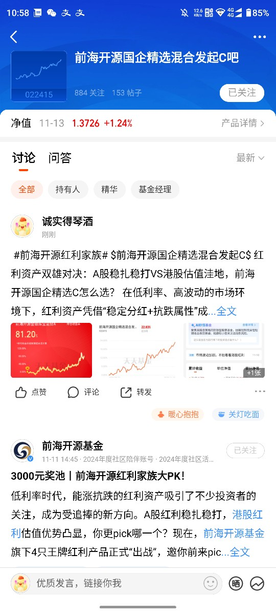 第二步:进入目标基金的讨论区,带话题#前海开源红利家族#并聊聊你对红利资产的观点——比如“为什么选这只红利基”、“前海开源红利基持有后的真实体验”等等+晒出加自选截图~(发布持有体验仅限于在活动发布前已持有产品的用户)