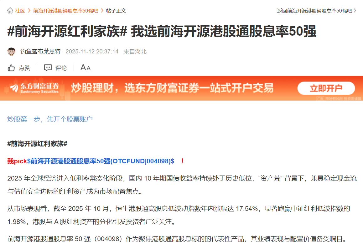 例子:#前海开源红利家族#我pick$前海开源港股通股息率50强(OTCFUND|004098)$!这只基金重点聚焦港股红利,首选基本面优异、低估值、高分红的股票!之前总觉得港股波动大不敢碰,试了这只才发现,原来港股红利也能这么香,打算长期拿着当底仓配置!。