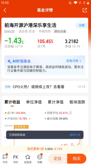 买了之后,我也没怎么天天盯着。市场起起落落太正常了,今天这个概念火,明天那个板块跌,消息看得人眼花缭乱。就像昨天(2025年12月19日),股市突然大涨,深证成指涨了3%以上。看到这种新闻,说一点不心动是假的,但我翻看了一下我的基金资料,发现它其实已经替我“握住”了这种机会。基金最新的十大重仓股里,就有新易盛、中际旭创这样的CPO核心公司。我不用自己去追热点、担风险,基金通过持有沪深300指数成分股的方式,已经自然地把这些优质的增长力量包含在内了。这种“被动”地站在时代发展趋势里的感觉,让我特别安心。