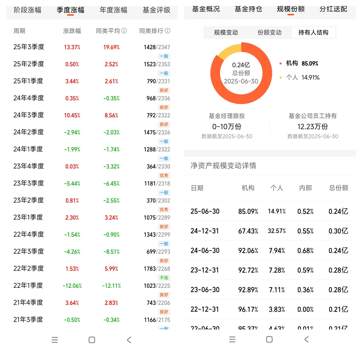 自从2022-09-20接管$鑫元鑫趋势灵活配置混合C (004849)$以来,3年又86天的时间任期回报18.8%,2个完整年度都是良好,处于平均水平以上,2022年4季度以来的涨幅有两个10%以上,跌幅最大也就是-5.44%,甚至于更小。验证了量化+主动管理的风控有效比较好。除了适合稳健投资者,风险偏好高的投资者也可以当压舱石来配置。这样的稳健产品,机构高比例持有它也合情合理了,机构投资者是高深度高广度的,他们的投资视野远比普通基民明亮。截止2025-06-30,机构占比85.09%,个人占比14.91%,内部持有0.82%。至于资产配置的股票占比与股票类型普通基民感兴趣可以去详情页看看,那是专业性极高的,我不能瞎说误导大家。我暗自在努力,加入了对股票池的简单研究。这是投资深度的学习。