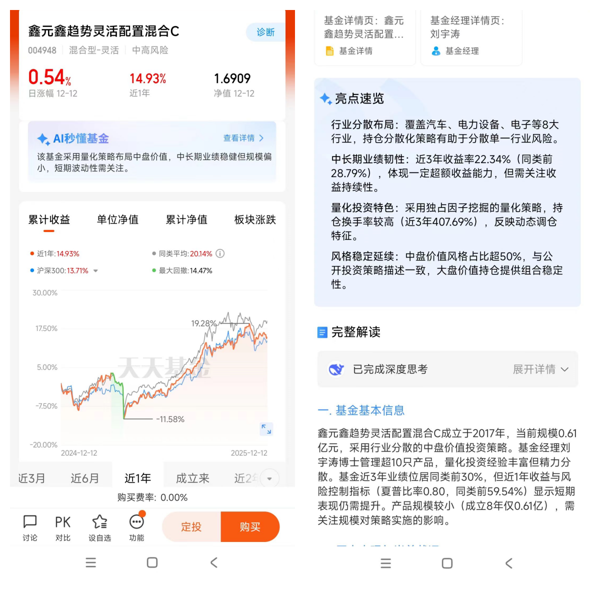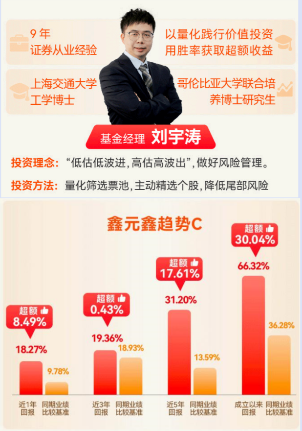 二、万事皆周期,万物皆规律。量化+主动的基金并非十全十美,我们要善于发现它的亮点,学以致用,为我所用,这才是理智投资者的智慧所在。刘宇涛经理在会上真诚表白:顺时买主题,乱时买量化,长期就看红利低波或者估值修复。有个疑难问题来了,作为普通投资者,能看清身处什么趋势吗?显然不会看,那就变通一下,主题可买点,量化要买点,红利低波或者低估修复的也买点,三合一的搭配左右逢源。那些能力强的就可以动态调节比例,获取超越平均的收益。$鑫元鑫趋势灵活配置混合C (004948)$的超额收益操作思路与我的想法有异曲同工之妙。