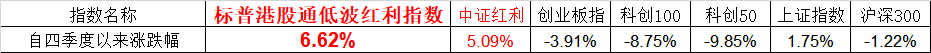 与之相对应的,顺周期属性较强的红利板块在最近行情震荡的四季度中也是逆势上涨。根据Wind数据显示,各大主流指数中,科创100,科创50等科技类指数出现了较大幅度的调整,分别是-8.75%和-9.85%,而沪深300,创业板指等宽基的调整幅度次之,分别为-1.22%和-3.91%,而像是中证红利这样的高股息赛道却逆势上涨,其中以港股红利板块为甚。具体来看,标普港股通低波红利指数上涨6.62%,中证红利涨5.09%。
