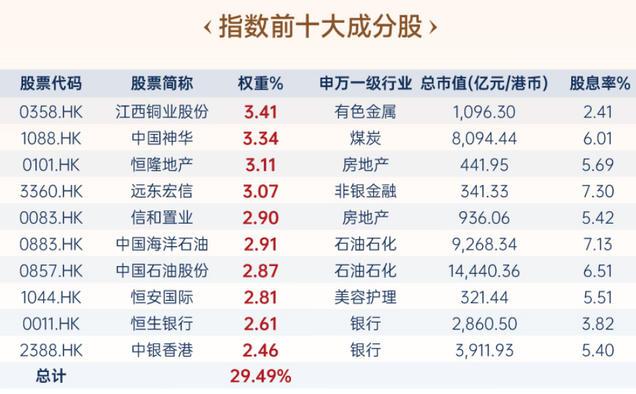 看前十大成分股更清楚,涵盖了有色金属、煤炭、房地产、银行等多个行业的高股息龙头,像江西铜业、中国神华、中国海洋石油这些名字,大家都很熟悉。而且前十大成分股的合计权重也就30%左右,行业分散度做得很好,不会因为某一个行业波动就受太大影响。更关键的是,这些成分股相对A股市值有明显折价,性价比优势很突出。