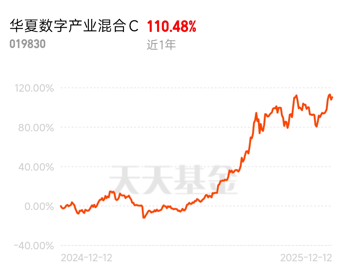 近6个月收益102.90%,近一周收益6.19%,长期收益可观,近期涨势迅猛$华夏数字产业混合C$还布局阿里、新易盛等优质个股,持仓还是不错的