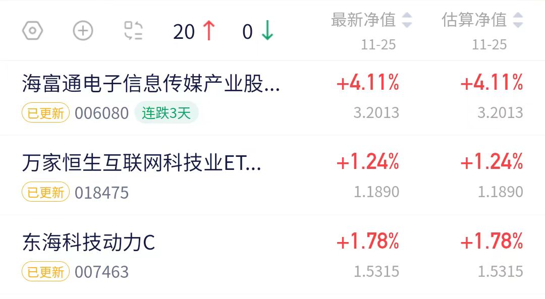 $万家恒生互联网科技业ETF发起式联接(QDII)A(OTCFUND|018475)$上涨1.24%$东海科技动力C(OTCFUND|007463)$上涨1.78%