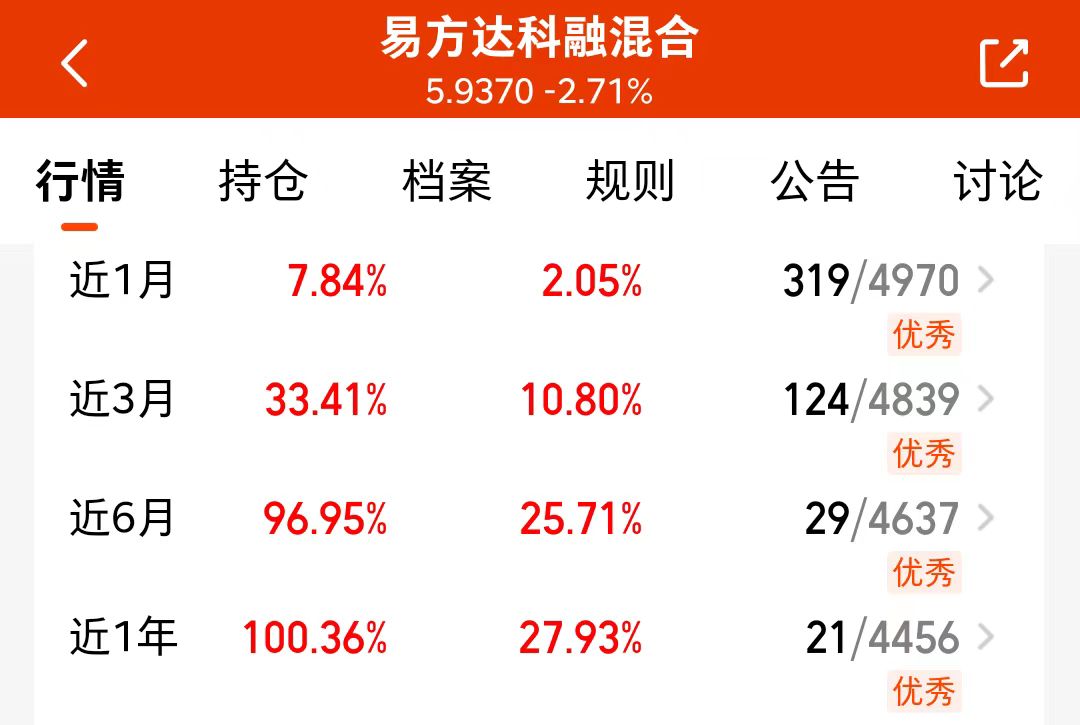 这两天股市行情有些震荡,科技板块短期调整,但是$易方达科融混合(OTCFUND|006533)$不仅布局了科技赛道,还配置了反内卷相关的新能源相关的,采用深度参与科技、新能源、军工轮动策略,业绩优秀,近一年涨幅翻倍啦。攻守兼备呢。