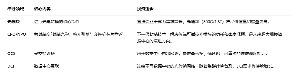 不可替代性:随着算力集群规模扩大,服务器内部(如GPU之间)、机柜之间、数据中心之间的通信对带宽和延迟的要求呈指数级增长,传统的铜缆方案已无法满足,光通信是唯一可行的技术路径。