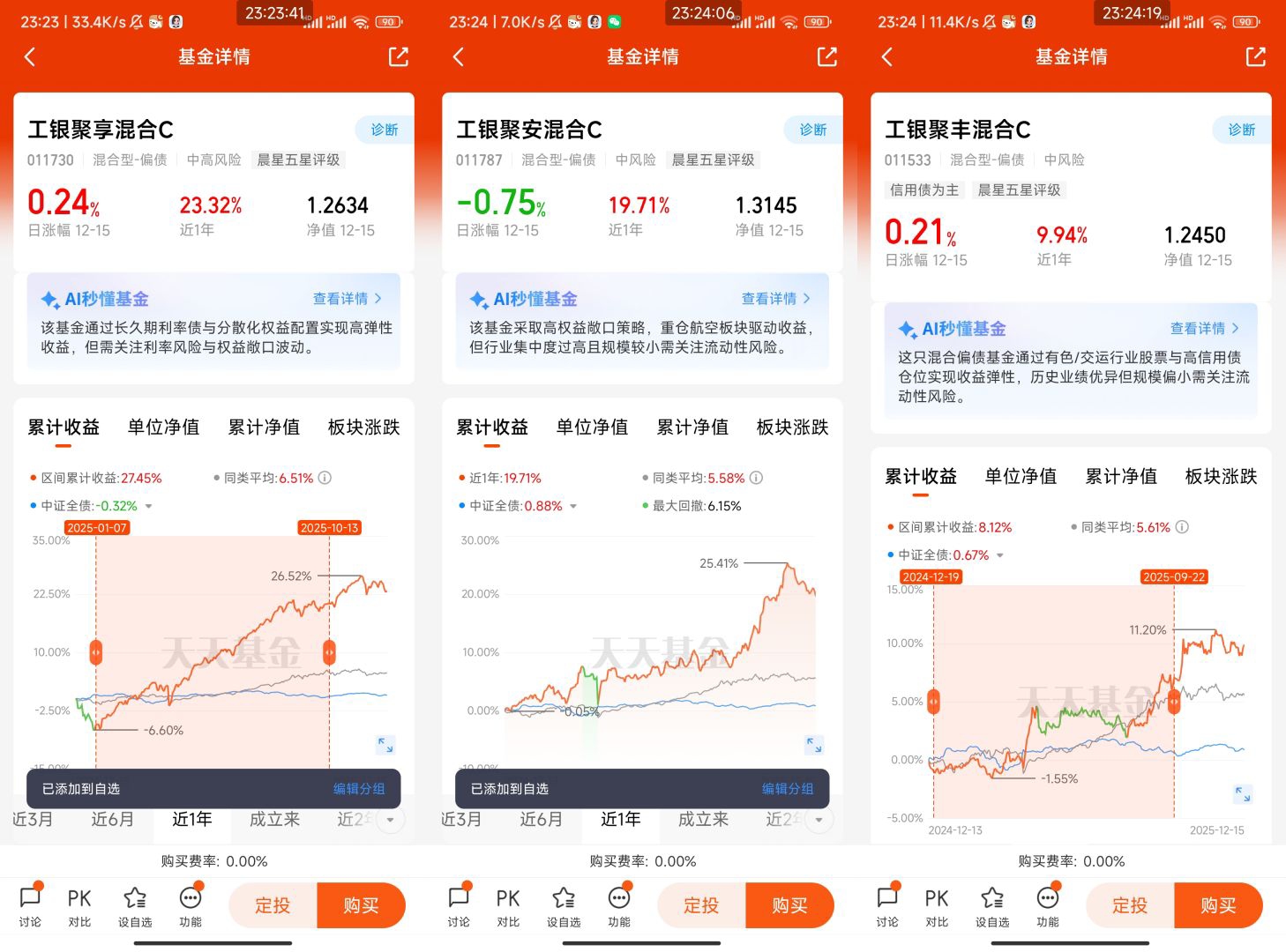 工银聚丰混合C(011533)采用"均衡价值+固收"策略,权益仓位上限40%,实