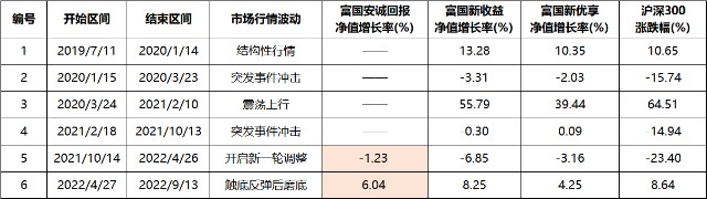于渤管理的富国安诚回报,去年10月刚成立就赶上了市场新一轮调整(区间5),但在沪深300下跌23.4%的情况下,净值仅下跌1.23%;在随后的反弹磨底过程中(区间6),该基金再次跟上了市场节奏。可见富国安诚回报虽成立时间不长,但已经展现出了于渤一贯的“能守善攻”的风范。