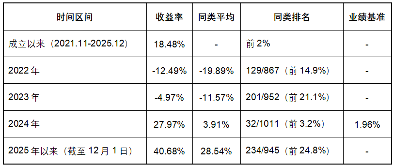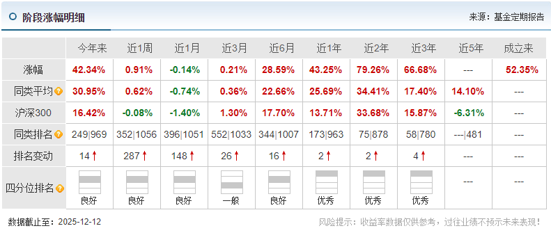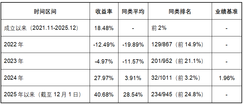 • 2025年以来:收益率40.68%(截至12月1日),同类排名234/945(前24.8%)