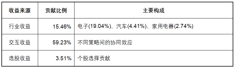 这种独特的策略架构带来了显著的效果。2024年,该基金的超额收益构成中,行业收益贡献15.46%,交互收益贡献59.23%,选股收益贡献3.51%,其中电子行业贡献19.04%、汽车4.41%、家用电器2.74%。交互收益的高占比充分说明了策略组合和动态调节的有效性。