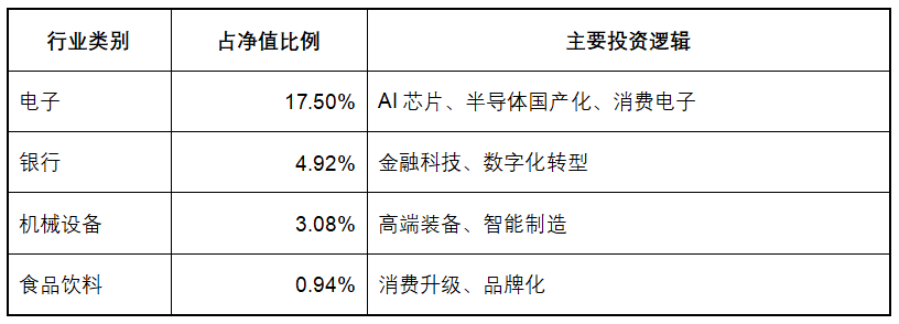 尽管基金重点配置了科技成长股,但仍保持了适度的行业分散。除了电子行业外,基金还配置了金融、消费等防御性板块,以应对市场风格切换的风险。