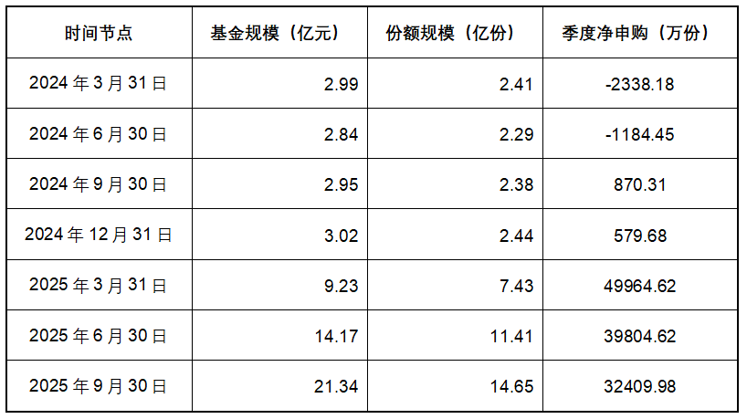 从数据可以看出,基金在2025年迎来了爆发式增长。特别是2025年一季度,规模从3.02亿元激增至9.23亿元,增长206%;份额从2.44亿份增至7.43亿份,增长204%。这种爆发式增长主要源于以下几个因素: