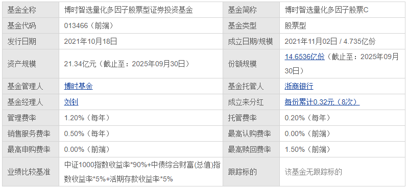 博时智选量化多因子股票型证券投资基金成立于2021年11月2日,是一只中高风险的股票型基金,目前由博时基金管理有限公司管理,浙商银行股份有限公司托管。该基金的投资目标是"通过多因子量化模型方法,精选股票进行投资,在充分控制风险的前提下,力争获取超越比较基准的投资回报"。