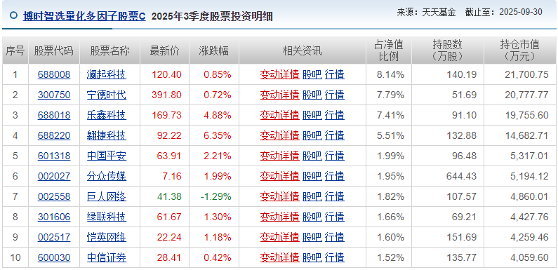 截至2025年三季度末,博时智选量化多因子的前十大重仓股充分体现了对AI和新能源等新质生产力领域的深度布局: